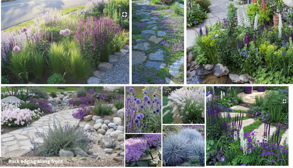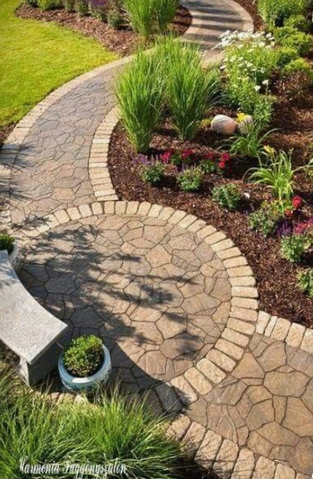 Photo is for the curving path design, not the planting. A circular stopping point with a bench close to the house, a little ahead of the south side gate (that leads into the back yard).