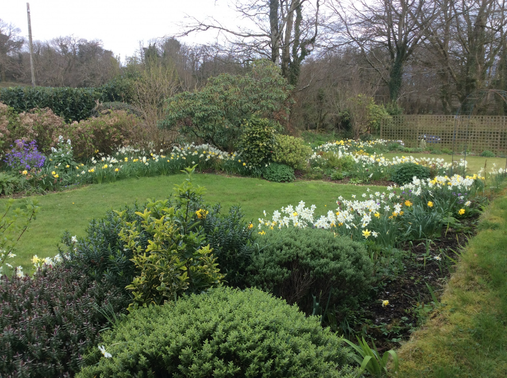 3rd April, all daffs are out, there are several clumps of Monbretia scattered around.