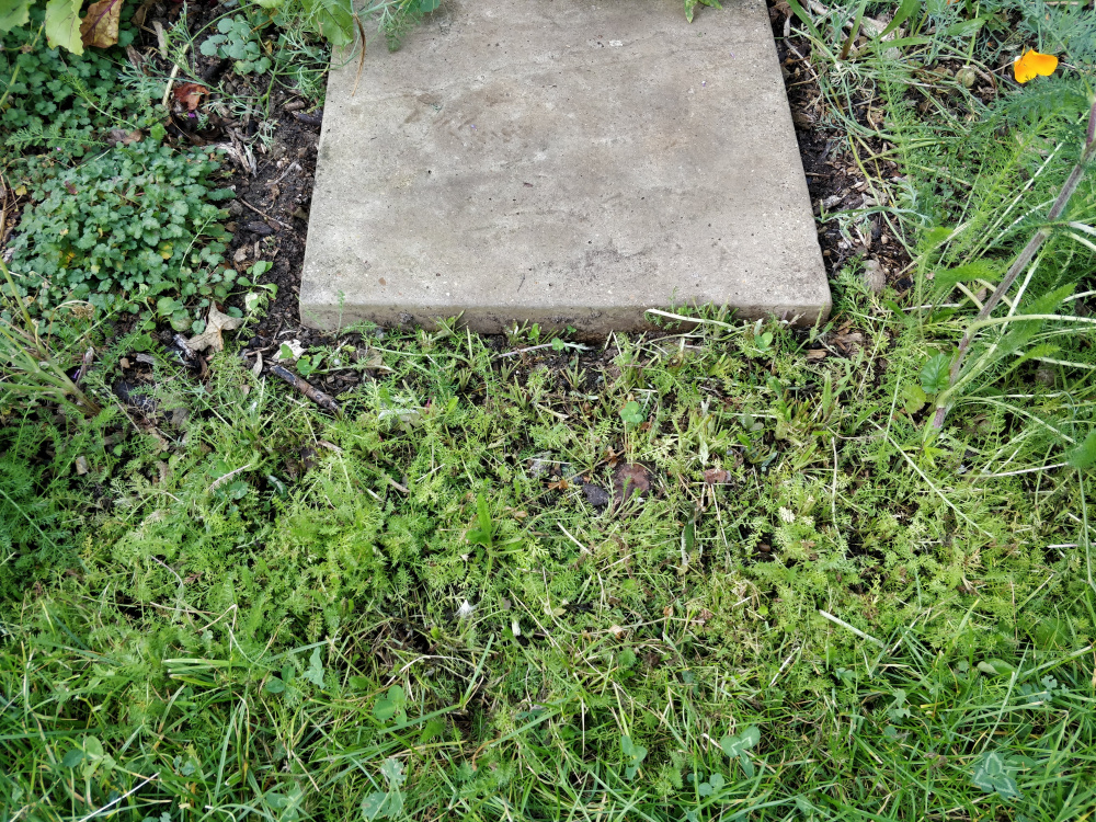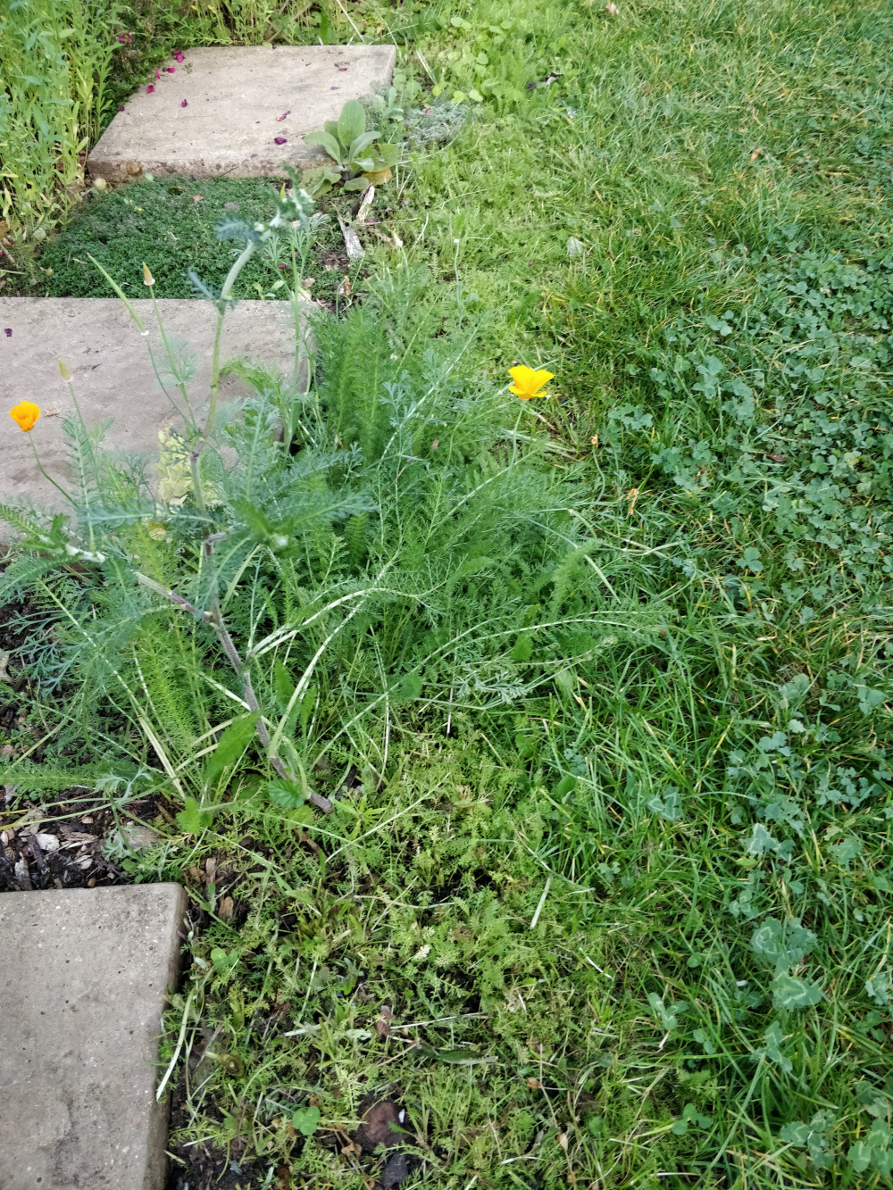 Where the yarrow mingles with some Californian poppies I've left it. My aim is to make the yarrow a boundary between the lawn and the low-growing plants on the left. I've dug in wooden planks as a sort of barrier. It may all end in tears if the yarrow spreads everywhere. Anyway the aim is for this to become a pretty wild and mingly border changing into lawn.