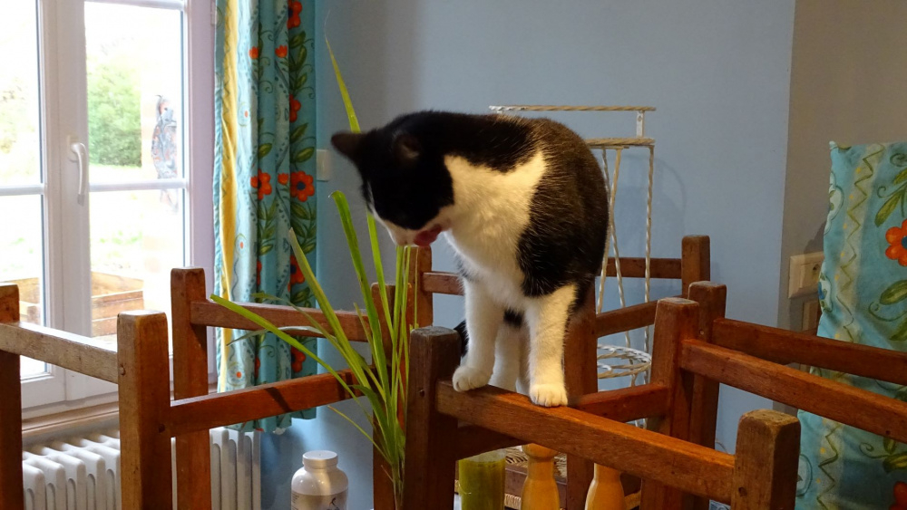 Today I caught her leaning across the back of a chair - back on the floor - to chew some more lemon grass.