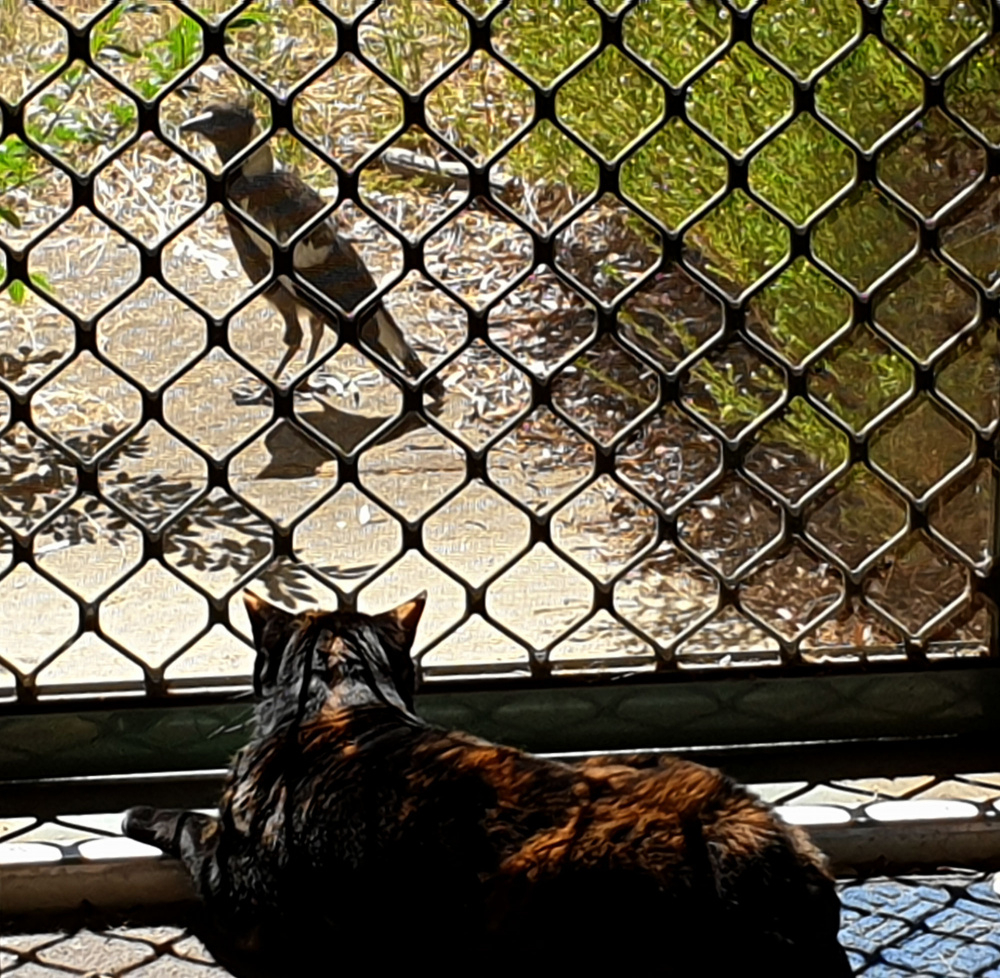 On a happier note, my son’s cat has a new friend. She sits at the front door and this young magpie arrives and they make little conversation noises to each other. Pixel is an inside cat so no danger of her getting out. This apparently happens each day.