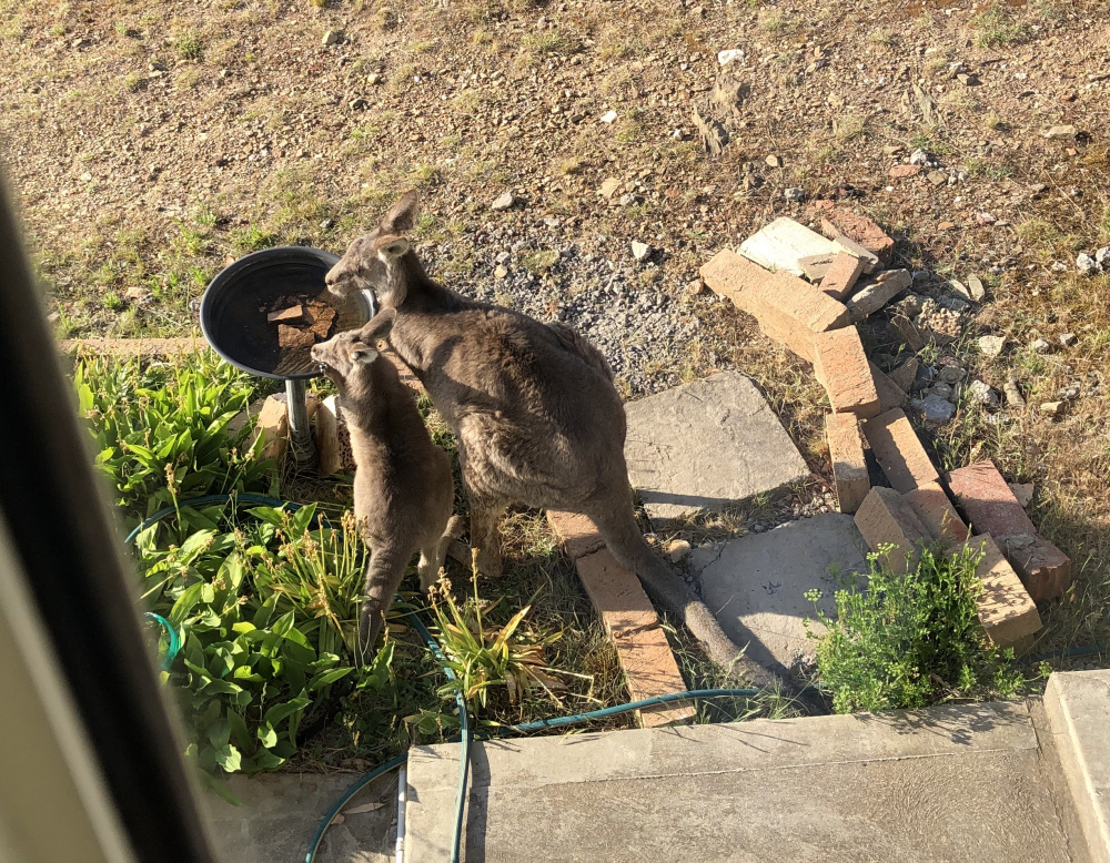 Hubby was woken at 4am by a sound of lick,lick,  lick. Looked out the window and found mum kangaroo and junior helping themselves to the bird bath. 😂😂😂. No wonder he had to keep filling it.Â