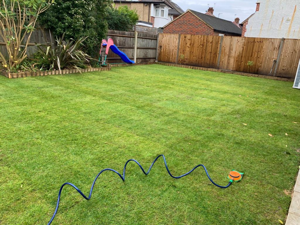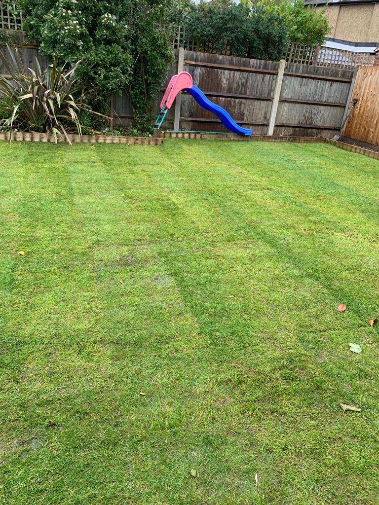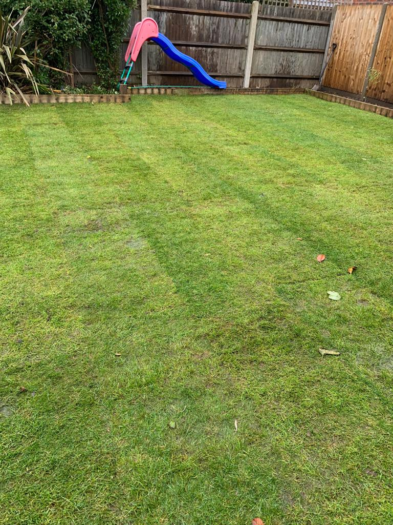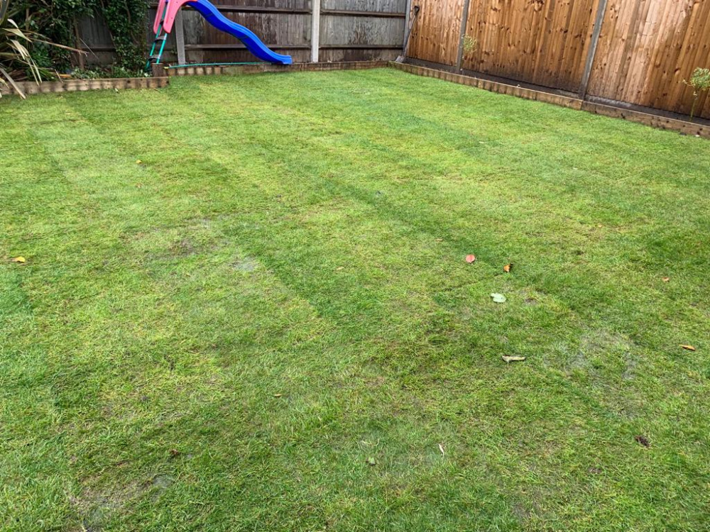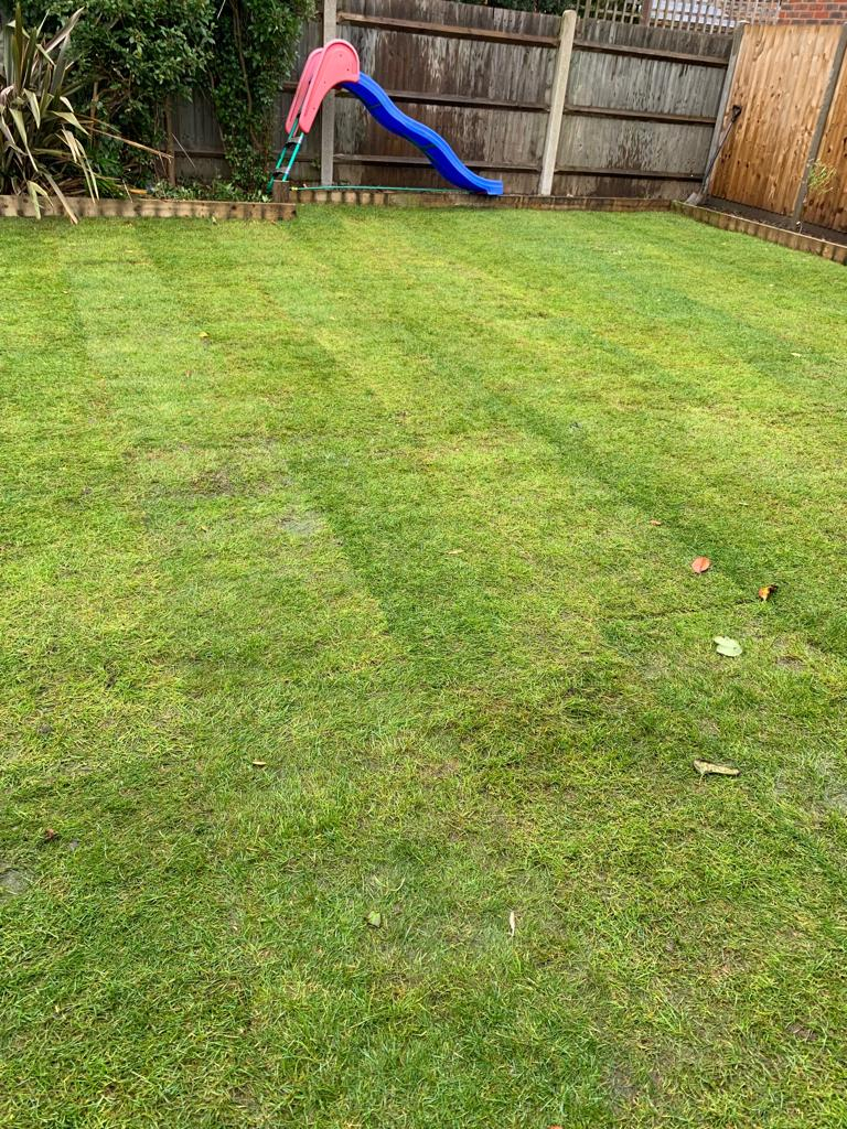 I'm inclined to agree with @Perki. The only other bit that looks a wee bit 'off' is on the left. If you look striaght down from the slide steps in that last pic - it looks a bit compacted and flattened, but the grass itself doesn't look the greatest. It'll get enough water now, so I think it's best left until spring to try and improve anything. It will probably settle a bit more over the winter too, and then you can take a view on it. I don't see that as much of a slope either - it wouldn't cause any problems in terms of using the grass, and you shouldn't have issues with water run off at the house end as the grass should absorb it