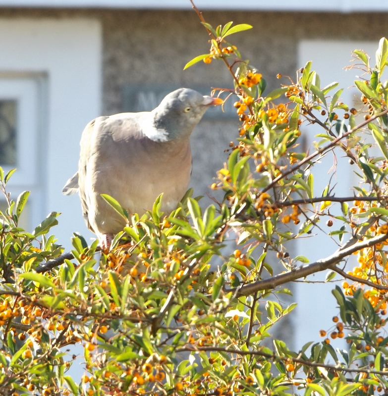 I think they're eating the berries on my laurel just now. I have one just to side/front of the house which provides a bit of windbreak and screening with Holly and Mahonia,and there's always some on the path around it. I can't really see that bit from the house, so I can't be sure. I had one sitting very neatly on the Pyracantha last year, stuffing his face