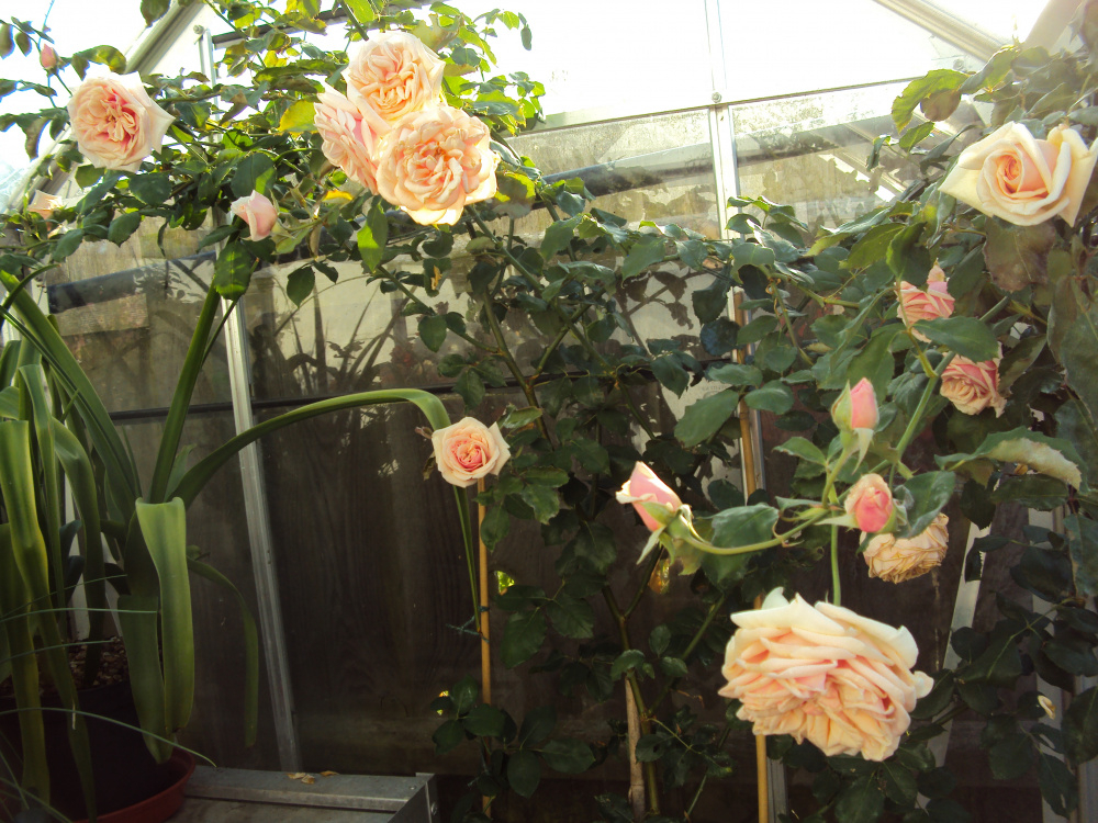 I used to have a greenhouse with a path down the middle... I think you could get away with 4 each side if they are only for cutting... I had this climbing rose in mine until recently, but it got too big.... small roses are the way to go..