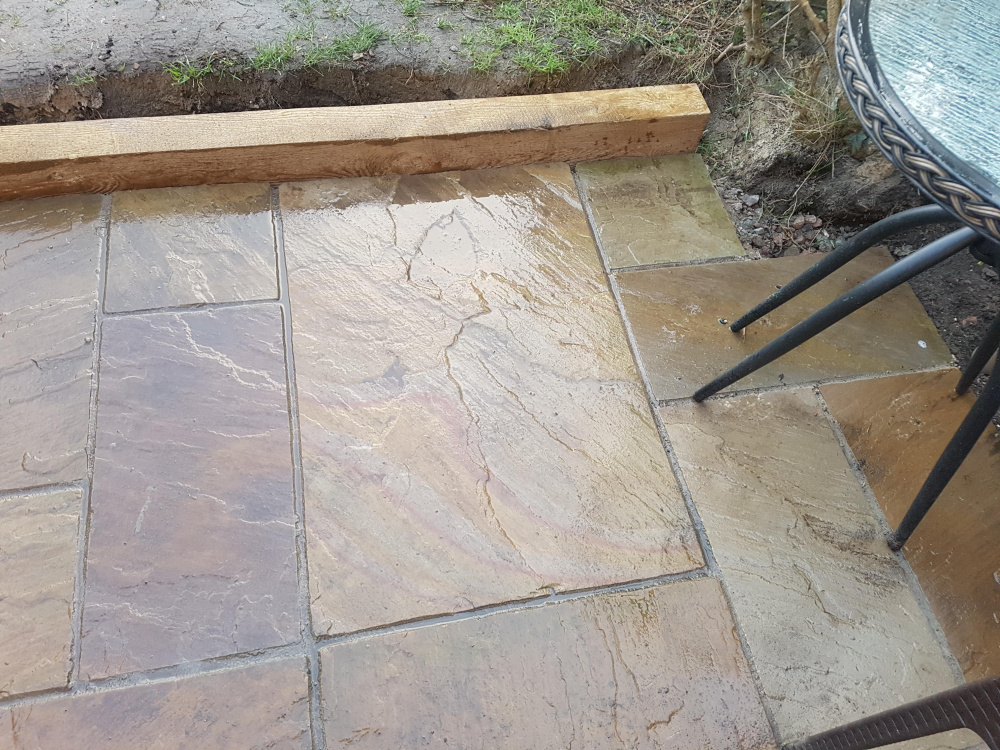 It looks a little messy, but I assure you those slabs are perfect, set on grit sand and each one dead level, this will be the base for my greenhouse, due to the nature of the slope in the garden, I had to remove earth to achieve a flat area, so I am about 5 inches below the actual garden at this end looking at the photo, all that soil is me digging it back, I don't want rainwater running down over the base once it's built. I was thinking of creating a shallow trench, and filling with gravel/pebbles as drainage, the earth where my spade is will eventually be a vegetable patch. Does anyone have some alternative ideas?