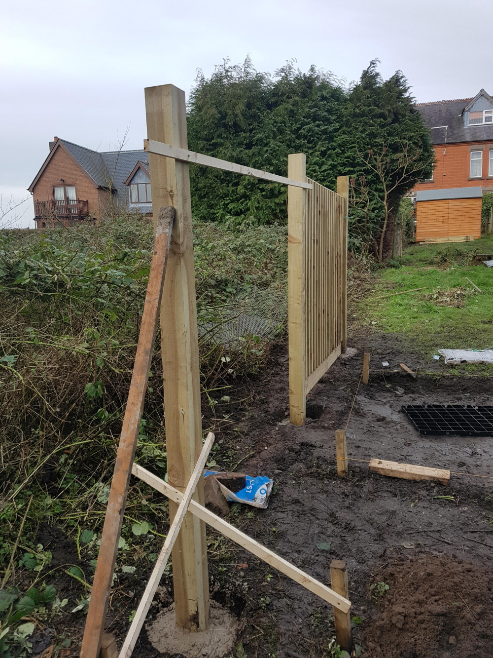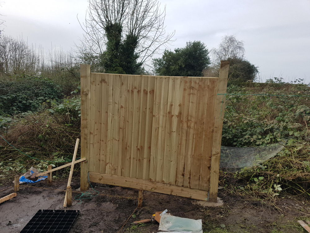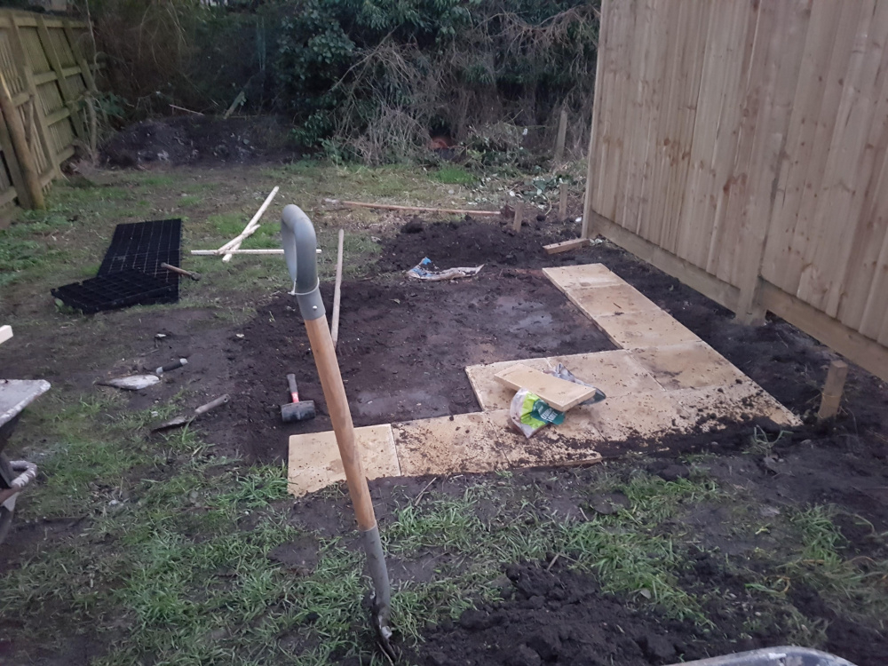 Well the first fence panel was installed on Sunday, and another yesterday afternoon, it will take some time to complete, in the meantime I have been levelling the area in front of the panel to make my greenhouse base, I was going to use the plastic grid visible in the picture, but decided on flag stones.
