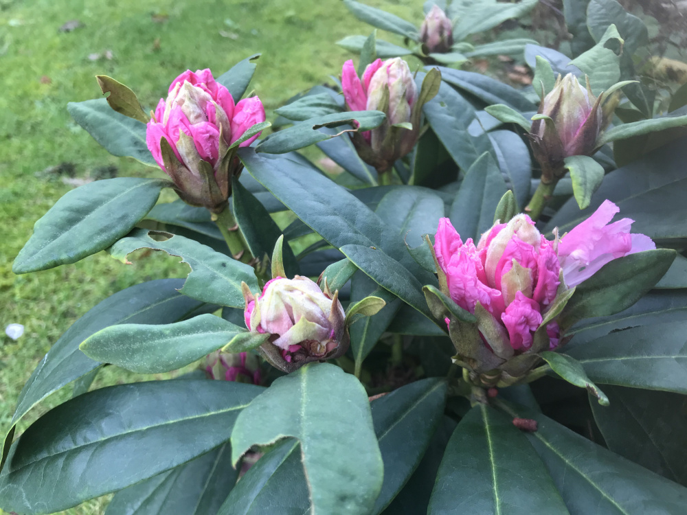 My rhododendron Christmas (or slightly later) Cheer is so close... (what's been nibbling my leaves!!!)