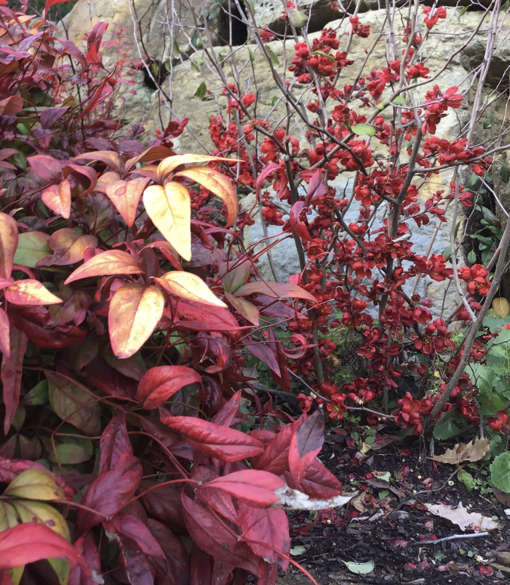 Nandina Firepower plus a red Chaenomeles in flower: