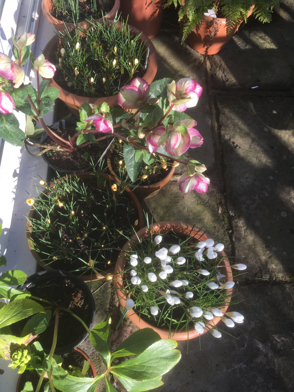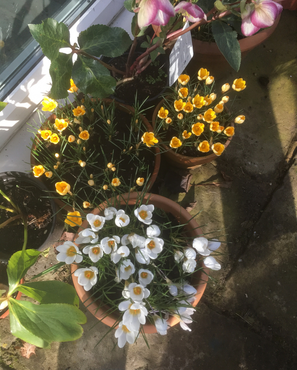They do decrease a bit over the years, but the pot of Crocus chrysanthus ‘Snow Bunting’ is probably three years old now. The yellow ones are Crocus chrysan. ‘Romance’ and there are some purplish ones ‘Blue Pearl’ coming along.