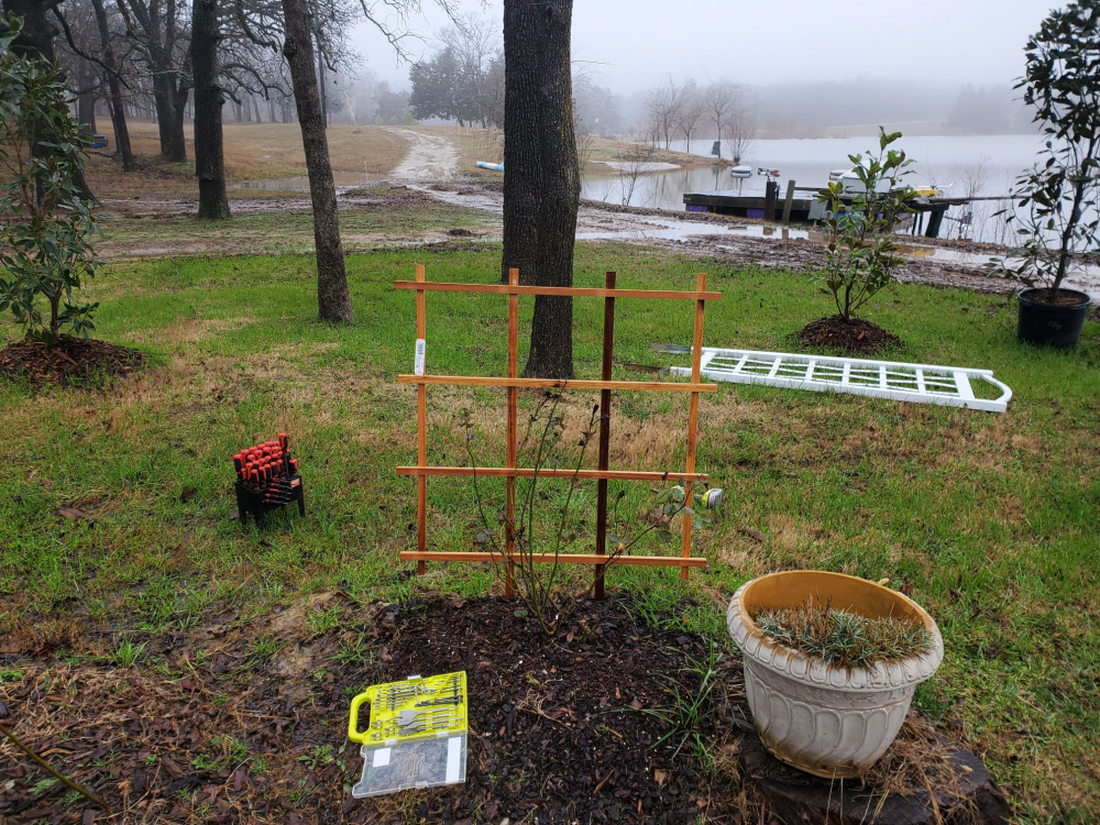 I wanted to section this area off from the rest of the property using magnolias. I thought the gate might look good? Is the color wrong? Should I add a climbing plant? Should I paint it? Should I take it down? Should I have planted the native magnolias in a straight line? I can dig them up?0