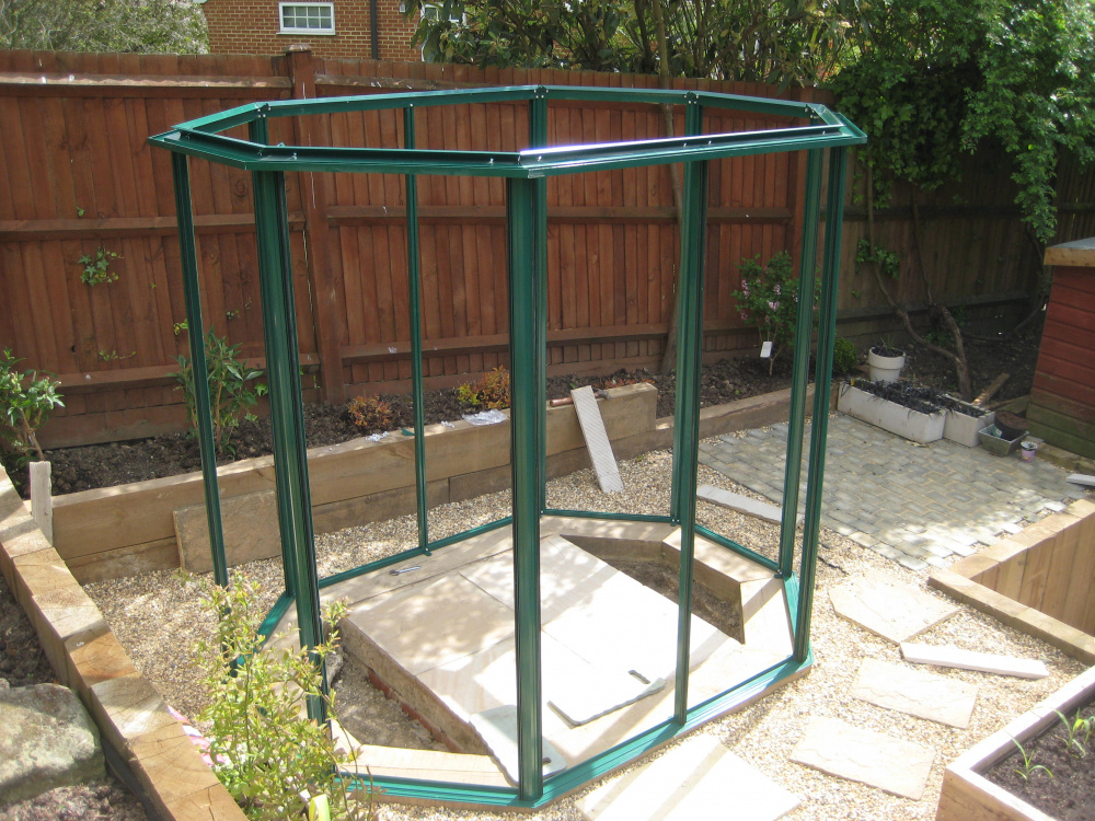 We bought a Robinson's greenhouse from Greenhouses Direct. So far it has been great, but I wouldn't buy hexagonal again, too difficult to find staging and shelving to fit it. We built a central base of brick/paving slabs, with some drainage/soil pockets at either end, into which we can plant tomatoes, etc. The greenhouse itself is sat on a railway sleeper base. This was it halfway through being built.