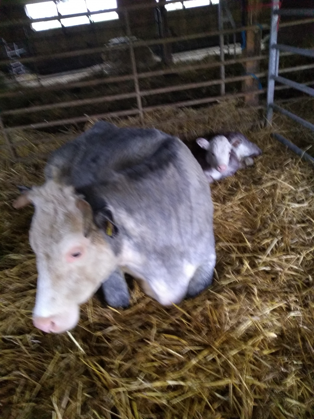 Andrew has said he can't be bothered now. We will make do with what we have. Luckily we have a few chickens and the suckler cows have started to calve. If we speak nicely to them they will let us have a jug full. Rowan and baby Holly.Â