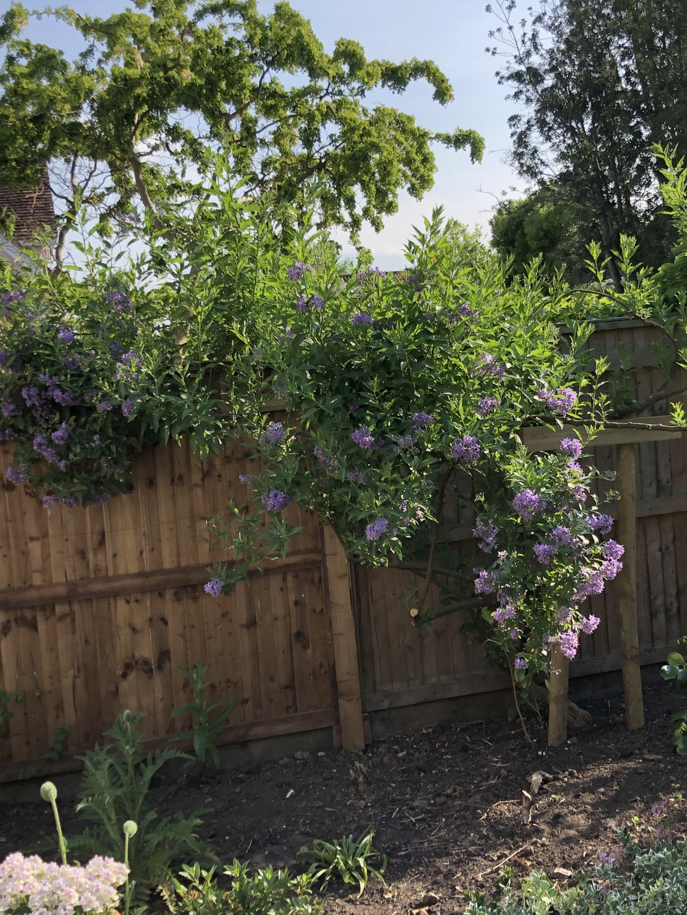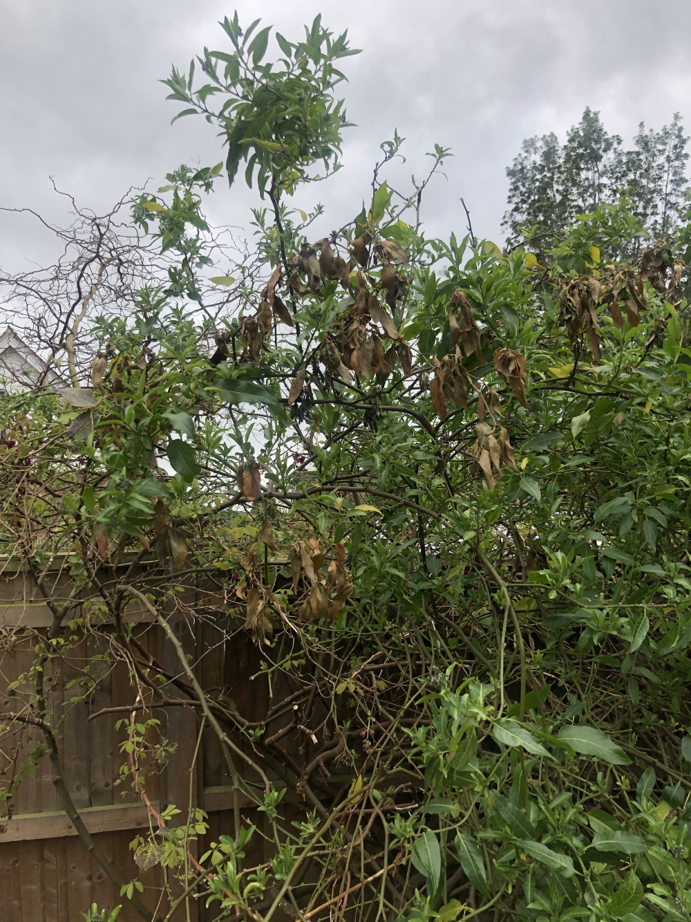 Attached are a few photos of a solanum that last summer was just a tangled mess with loads of dead wood and branches. When I started to prune out the deadwood, it turned out there were 3 different shrubs all muddled up together, 2 of which were dead. I cut those two right back and also cut out dead branches on the solanum. It seemed very happy with more room to breathe and hosted a superb set of flowers for the whole summer. However, since I pruned it some leaves are curling up and dying, usually whole branches. I hope you can see from the photos. I’m starting to lose a significant part of the shrub. Have I done something wrong? What should I do now? (The climber clambering through is it a chocolate vine from next door.)