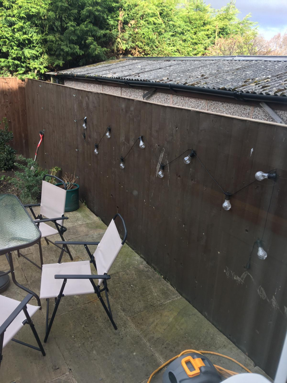 Our south facing wall is also the one which borders our patio area. As you can see from the photo, it's bare and ugly, save for a few old crappy lights. It gets light for most of the day, until the hedges block out the light in early evening/late afternoon.