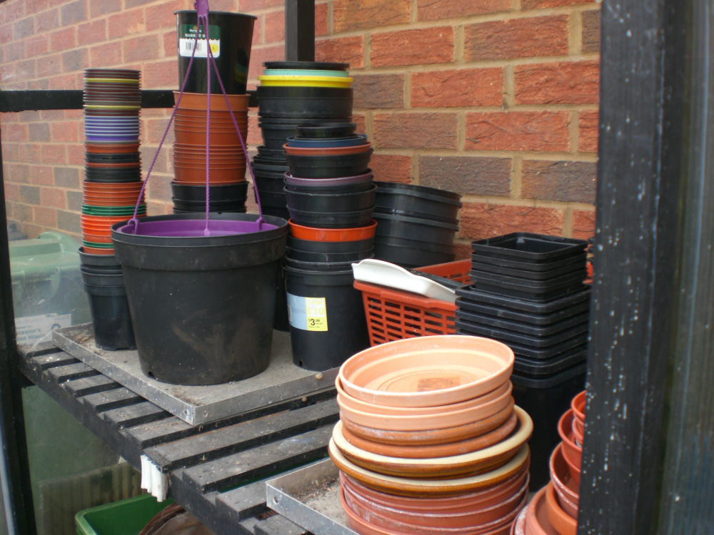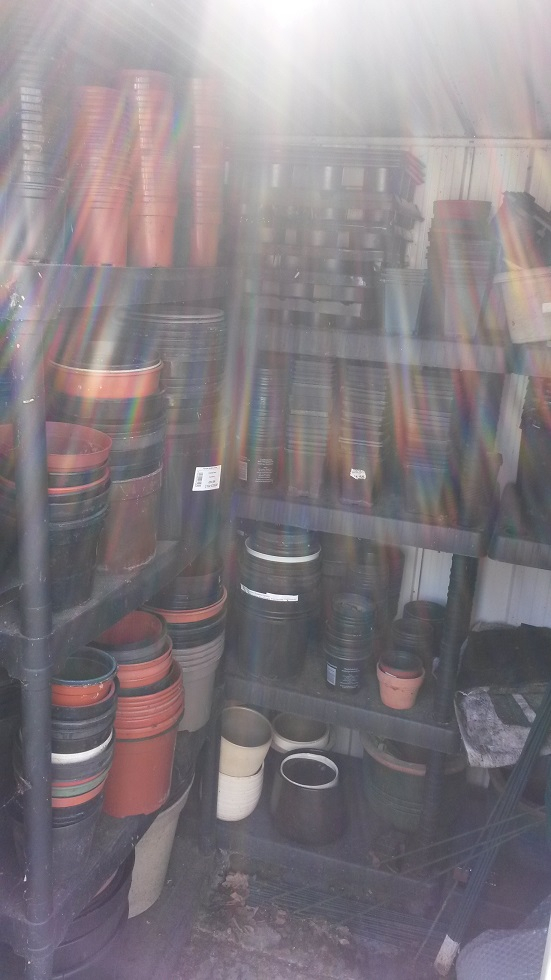 Stacked in similar size piles, crammed onto the shelves and floor in the garden shed-anywhere they fit. Some aren't even washed. I tried, but the toddlers thought it was more fun to add rocks and dirt to the cleaning water.