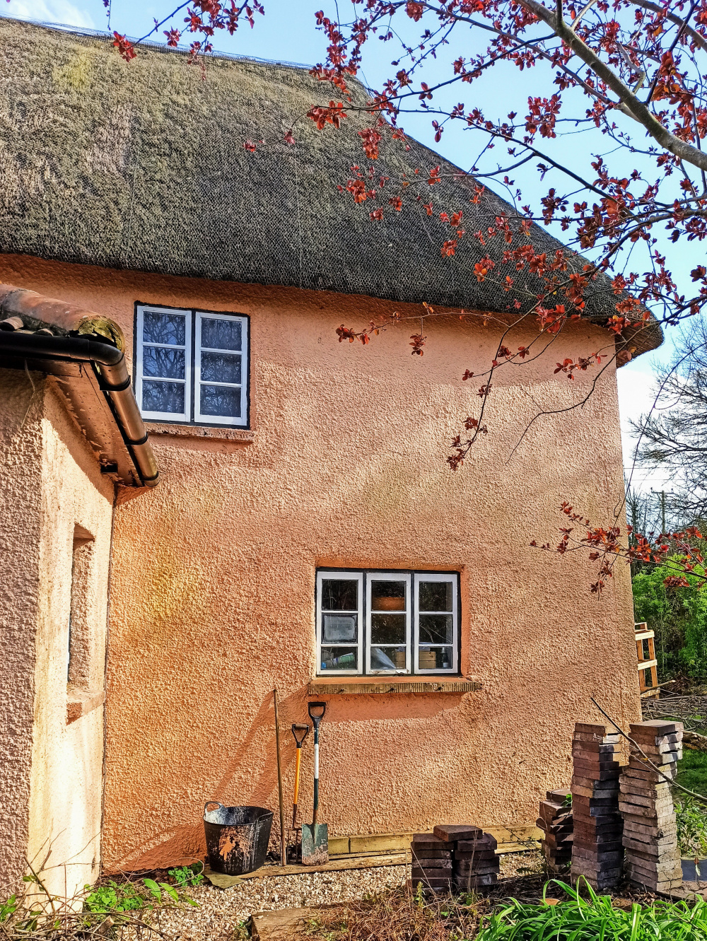 I am looking for advice on how best to cover a north-facing wall on my 18th century thatched cottage in (sometimes) sunny East Devon. There is a photo below.