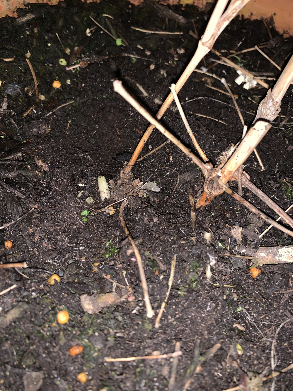I removed the weed from my pot, and noticed that there had been a single green shoot coming from the root stock of the thilactrum, but it I had damaged it when removing the weeds. (Second picture)