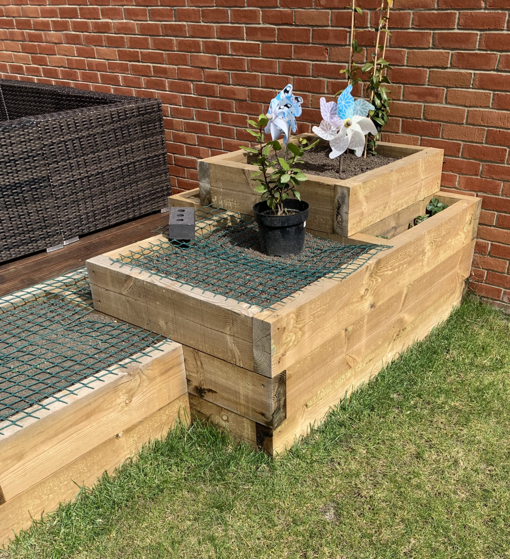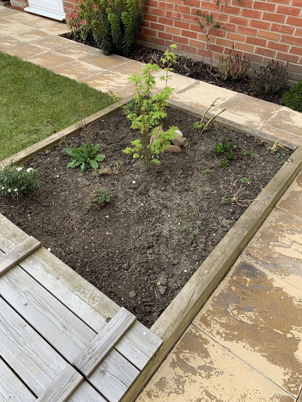 I also need a perennial for the nearest corner of the single level bed and some small colourful annuals to fill in any spaces. The other plants in that bed are Dianthus (bit poorly). Lilium. Some small and big Geraniums, Choisya Ternata, Salvia and a Lupin along with the Acer in the middle.
