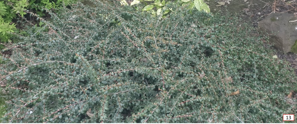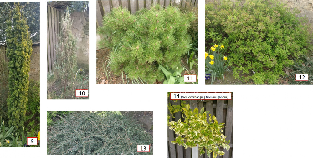 2 - Euonymus Fortunei 3 - Could be Jasminum Nudiflorum, Winter Jasmine 7 - Chaenomeles, Flowering Quince 8 - Acuba Japonica 11 -Possibly Pinus Mugo 12 - Looks like a Spiraea shrub, but not sure which one 13 - Maybe Cotoneaster Integrifolius 14 - I think Ligustrum Ovalifolium, Golden Privet
