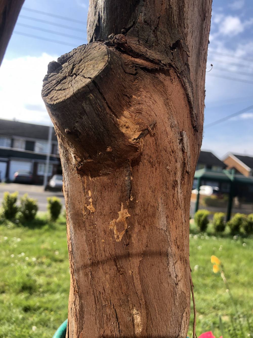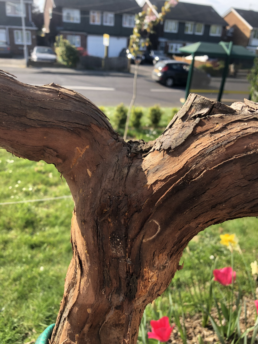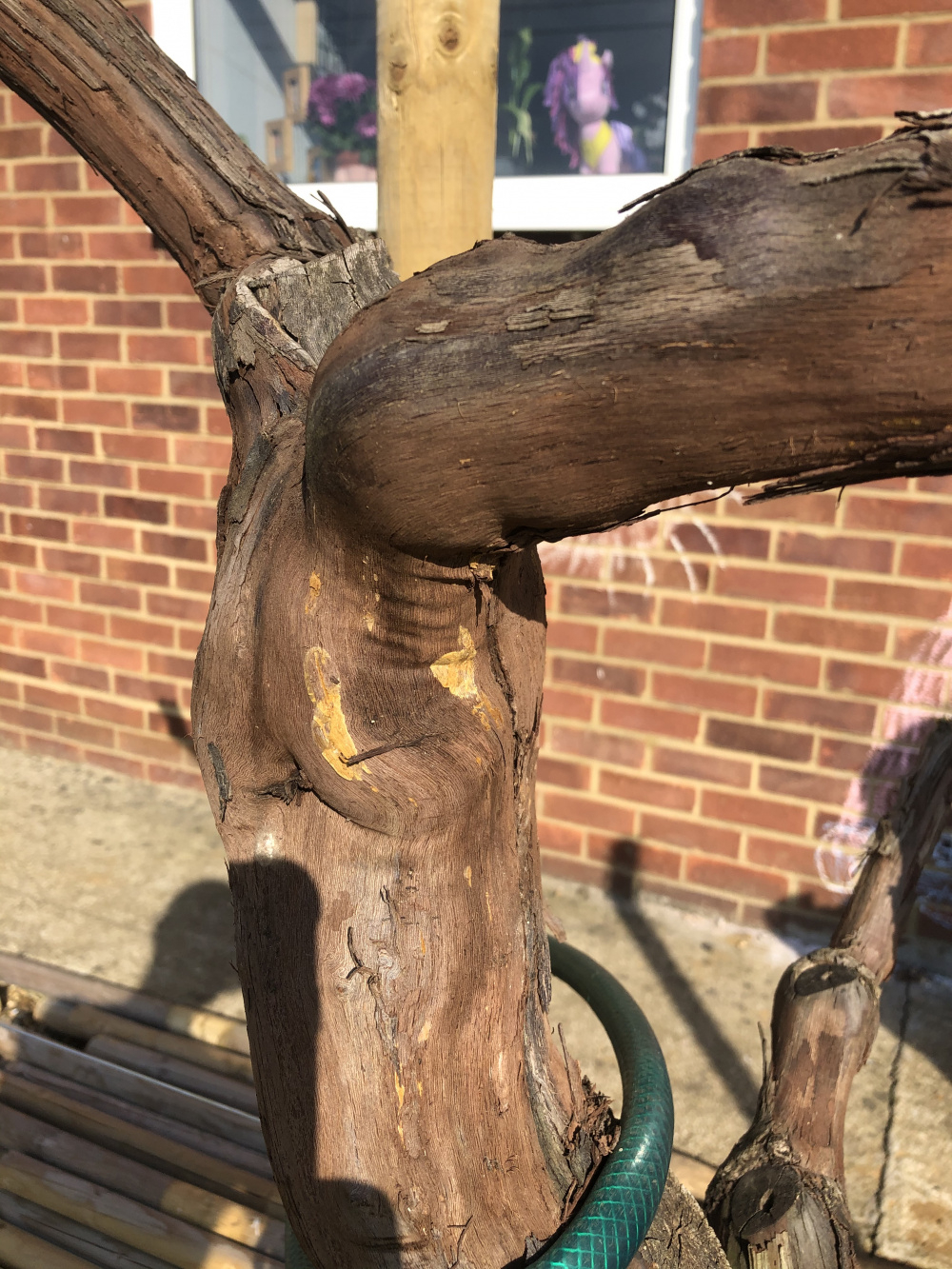 I bought this big grape vine in the autumn and it is now showing the first signs of life. However, I think the larger branch has died. What do you think? And does it need cutting off? Pictures show the whole thing and then some close ups of what looks like rot on the big branch. Thanks