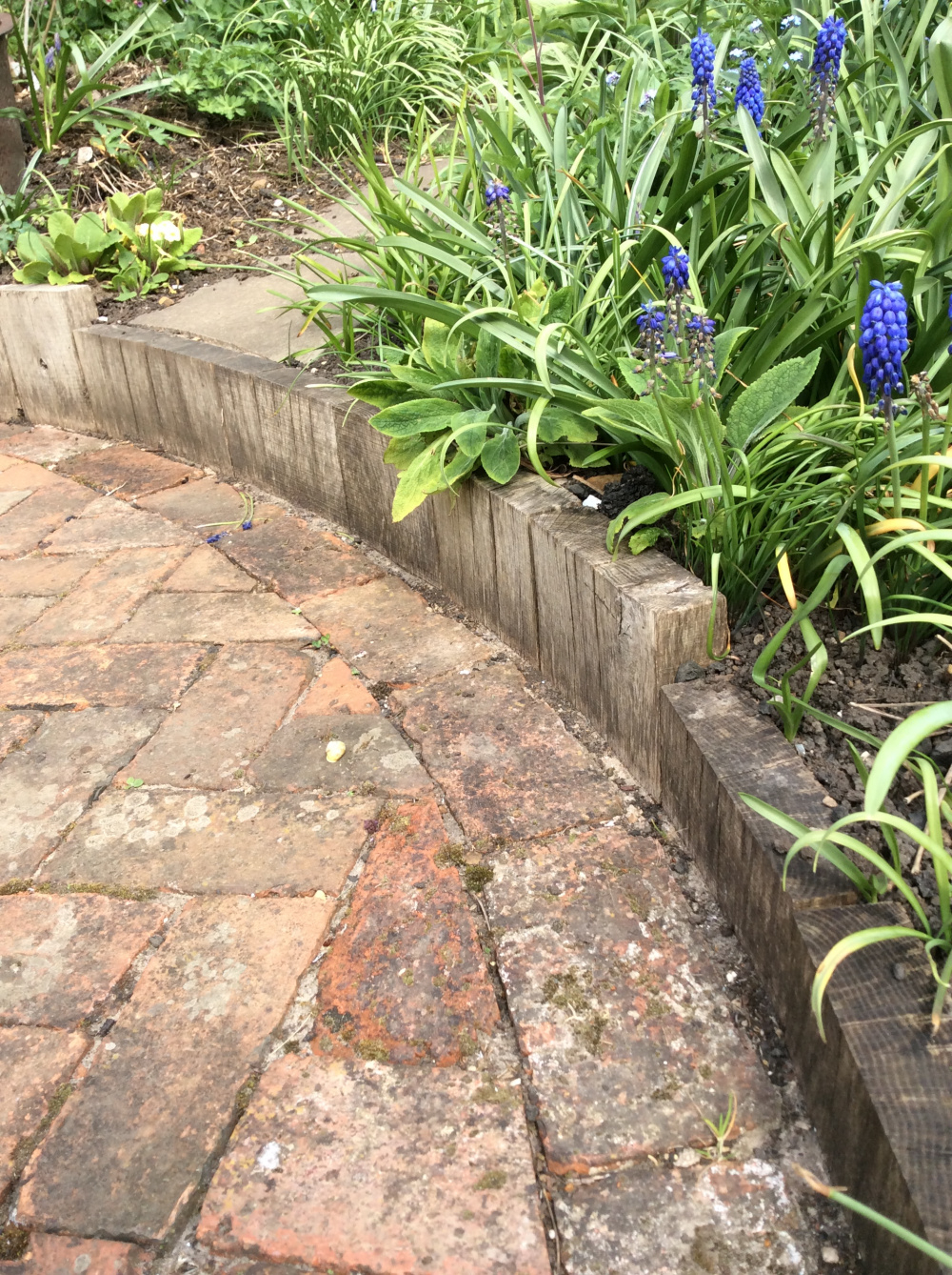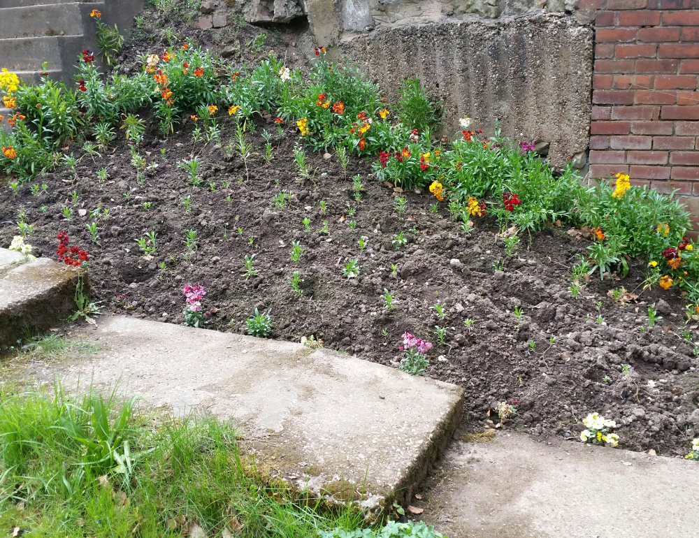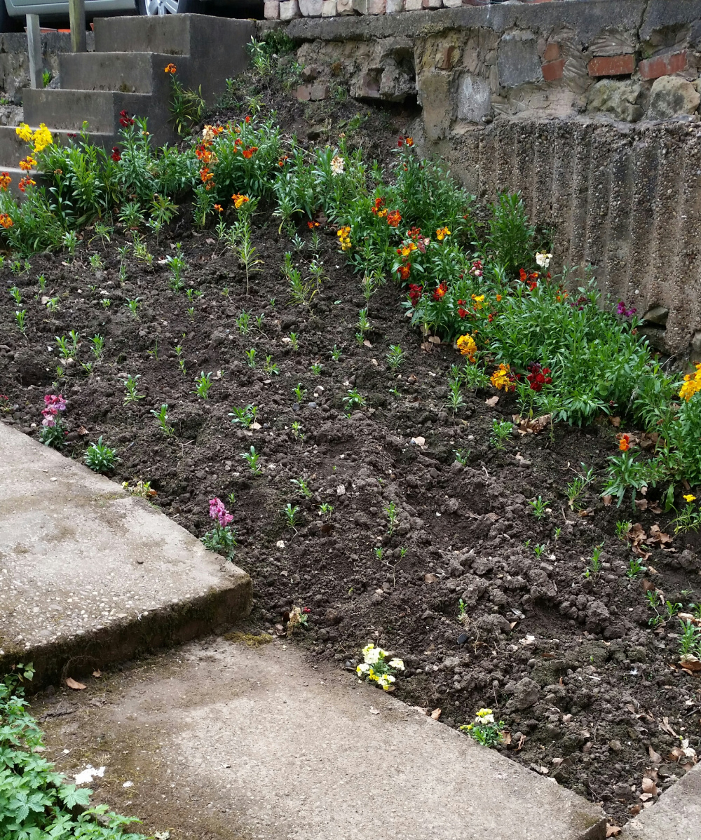 Whoever laid the drive did a bit of a bodge with the shuttering. Instead of using plywood for a reasonably flat neat finish, they have obviously used something like corrugated steel sheet material. This means the area looks even worse. As it is not flat, securing some screening material to the unsightly area will be that bit more difficult.