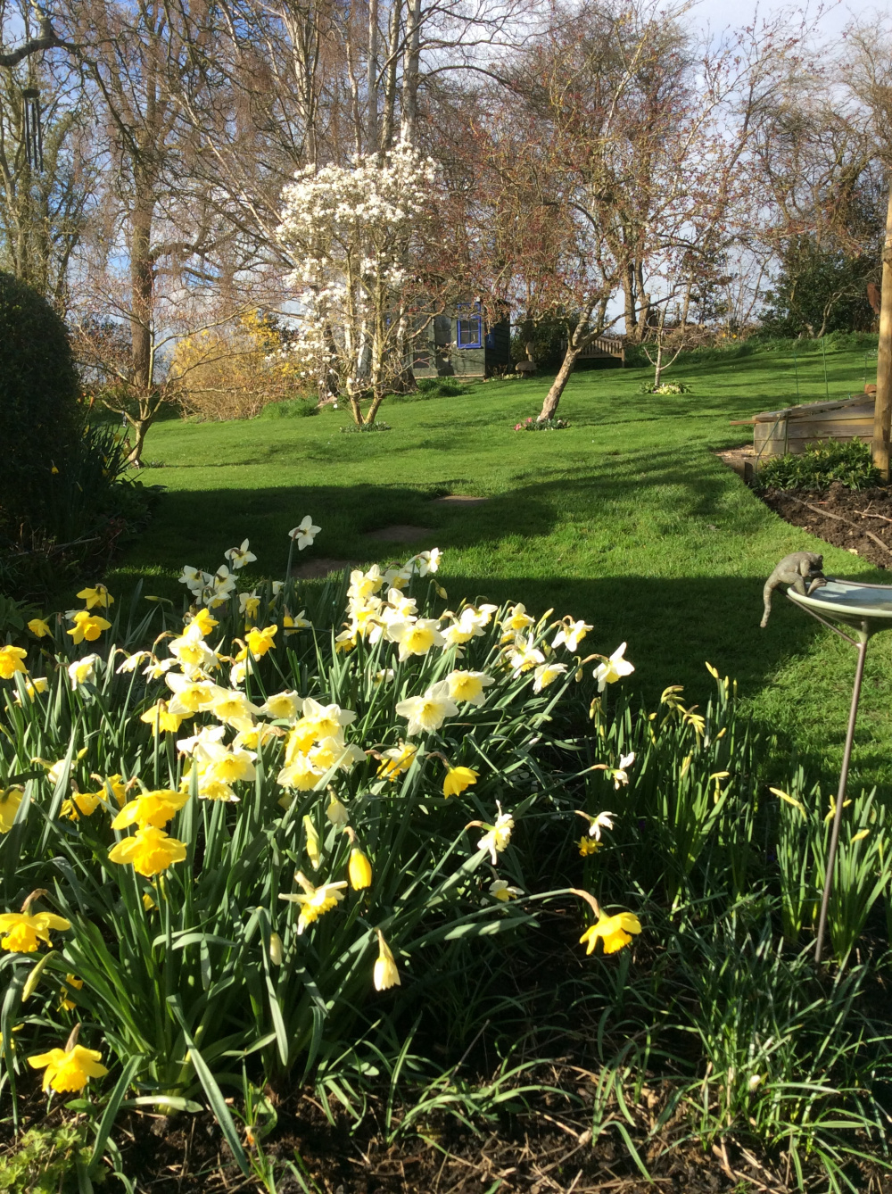 And then the Rozanne takes over. The other geranium is Anne Thompson (or maybe Ann Folkard) growing through a peony support for extra height. The bird feeders have been moved for reasons of avian hygiene but the bird bath is in the same place.