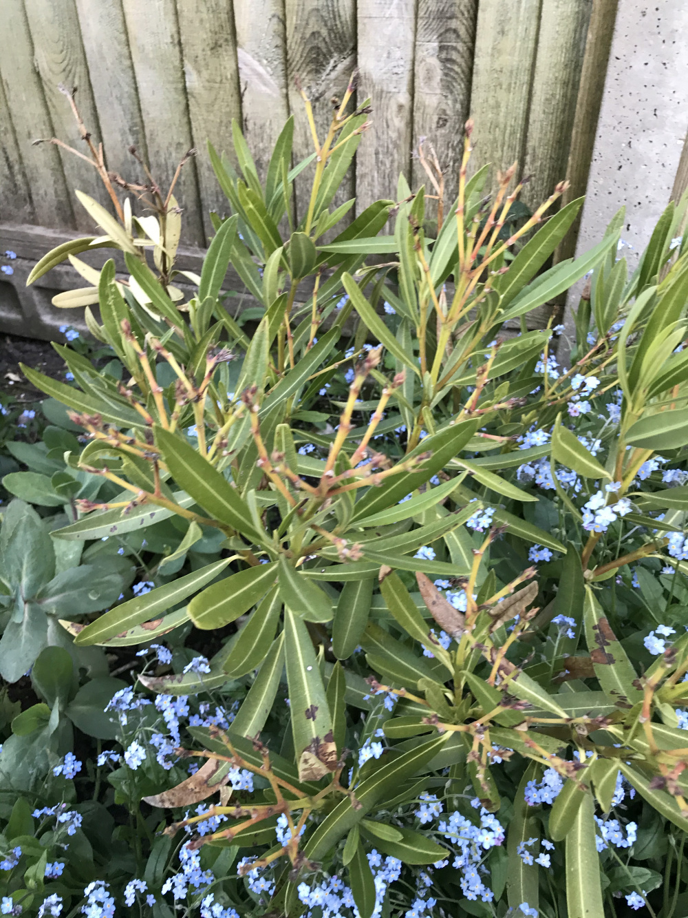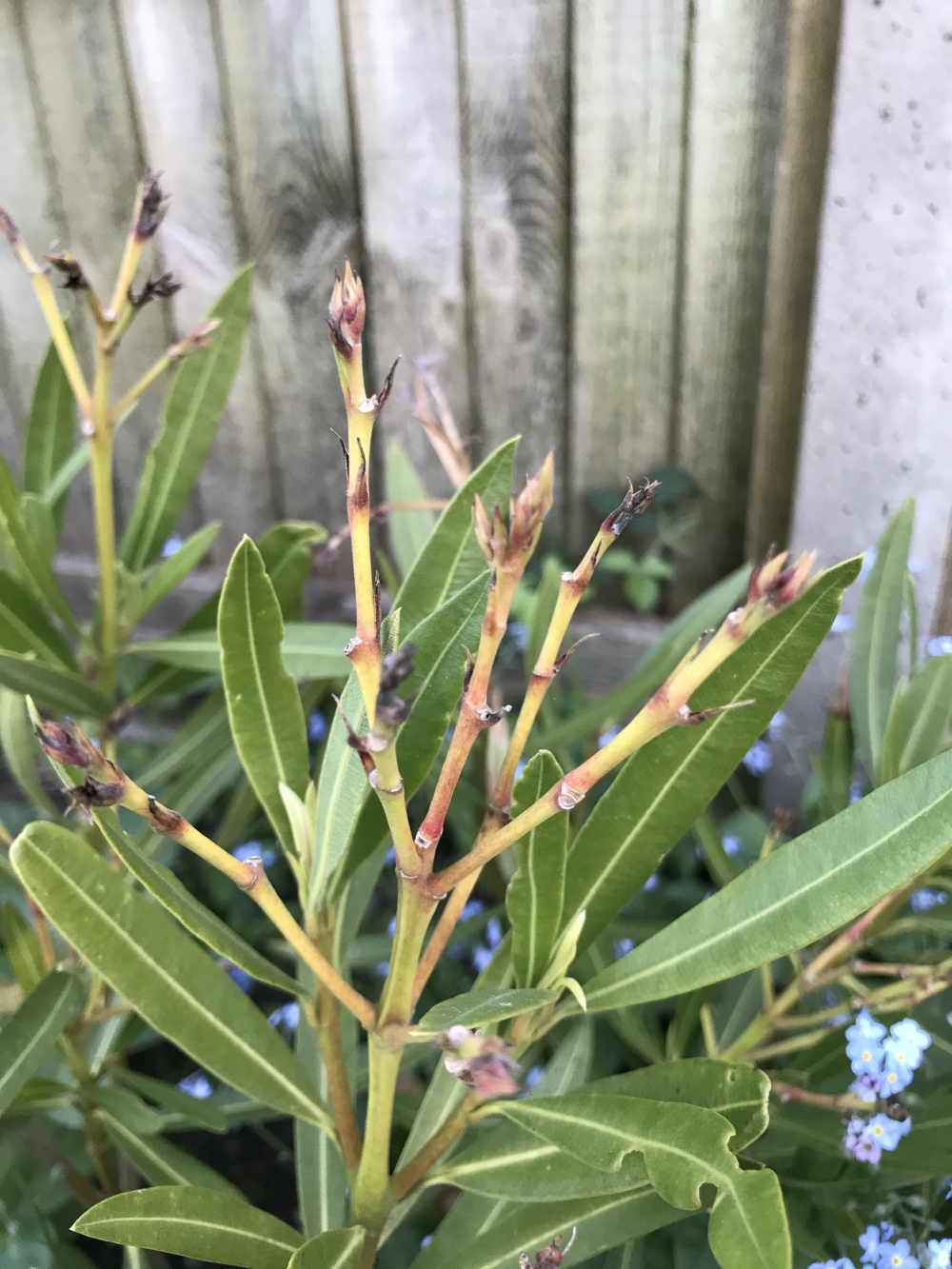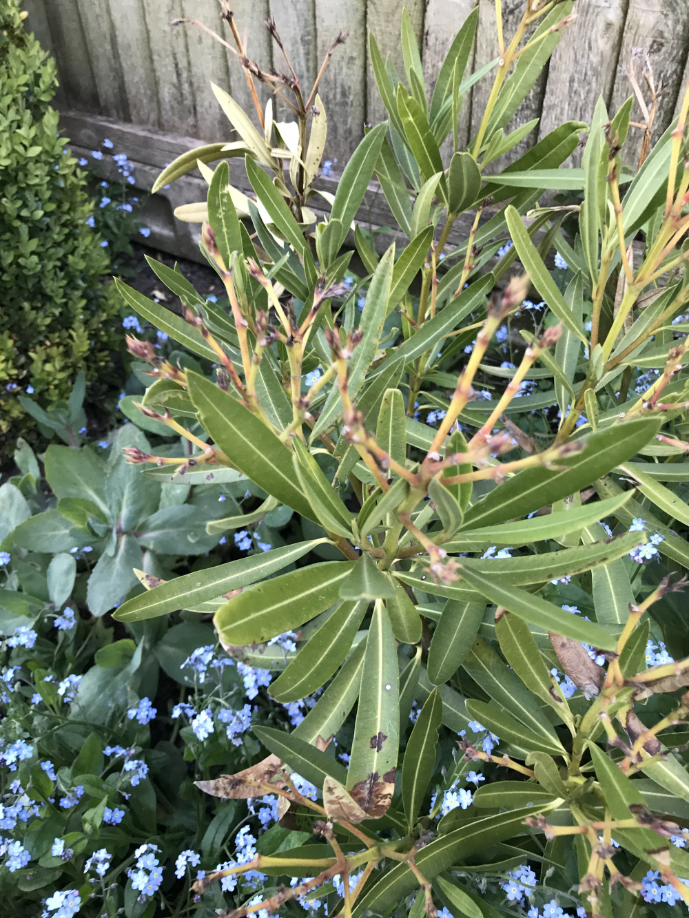 Hello I have what I think is an oleander in the border. Not sure if it will flower this year looking at the tops of it. Should I trim or just leave it be? Thankyou x
