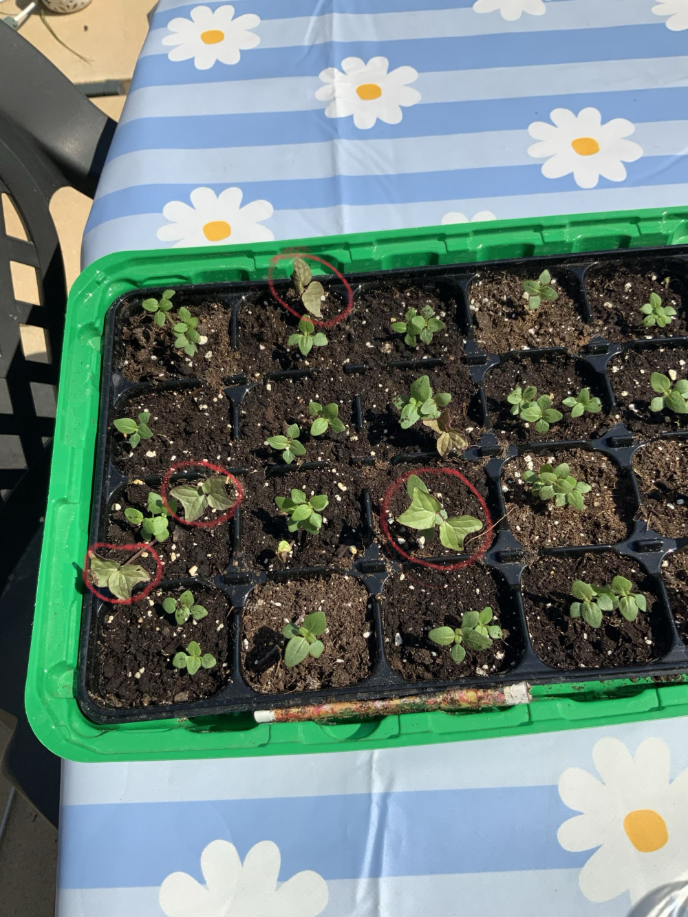 Little mystery. I have a nice tray of snapdragon seedlings and what look like a few intruders. Any ideas what they look like?