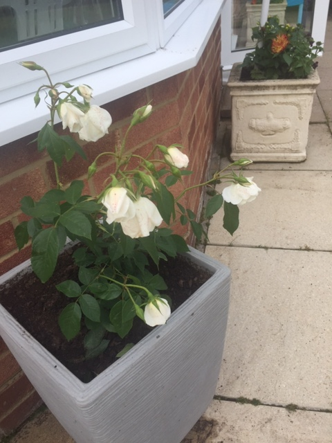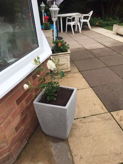 My son and daughter-in-law bought my husband and I for our Diamond Wedding Anniversary this year, the most beautiful white rose plant. I left it in it's pot till I managed to buy a new container and two days ago I transferred it from the original pot to a brand new one filled with John Innes No.3. I had read somewhere never to put another rose in a previously used pot. It had beautiful flowers and today it is droopy and I'm scared to death I'm done something wrong. Please help!!