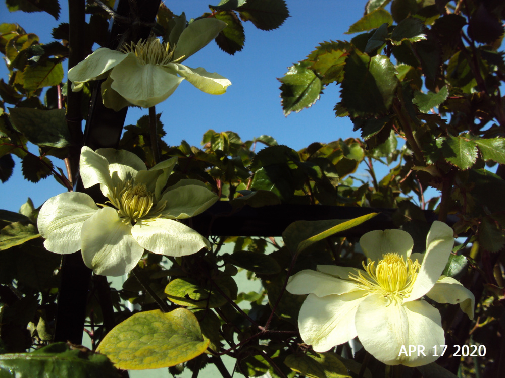 They’re supposed to have clematis Niobe growing up them but snail damage to the stems meant the plants have never really got going. This year, however, it’s looking good. And that’s sod’s law because last Autumn I planted rose ‘The Pilgrim’ there as well. Maybe soft yellow will combine well with deep plum red but I have reservations. A single Niobe bloom is just visible in the picture.