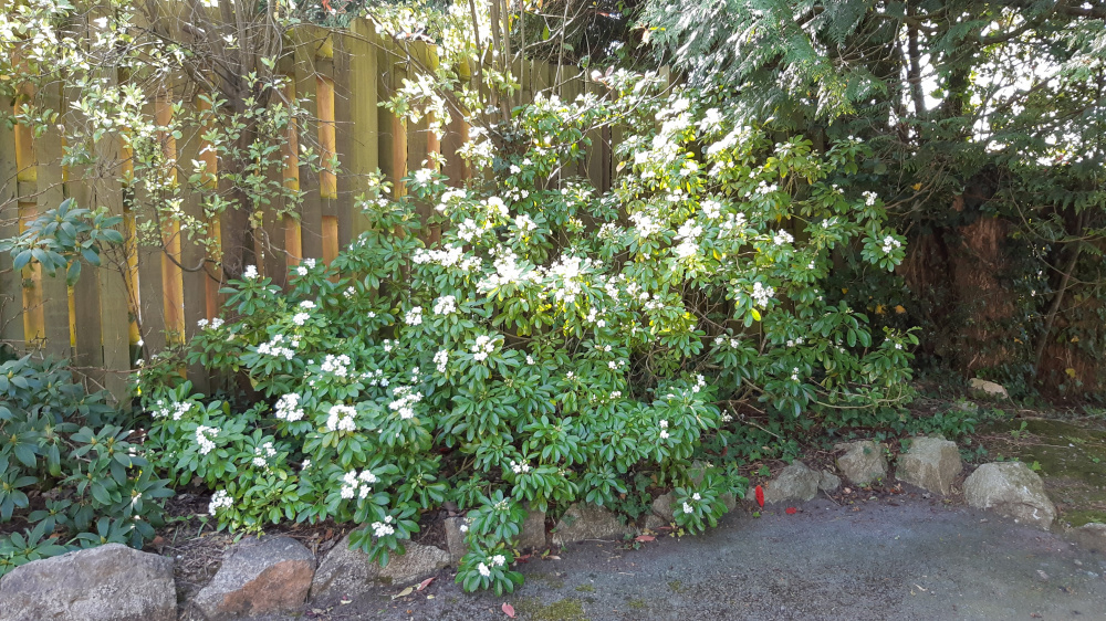 I'm trying to identify this beautiful shrub which is in a corner of our drive. As you can see, it seems to be doing very well in this shady spot (doesn't get much sun as there's a large conifer just to the right) - just a bit of dappled sunlight through the day.