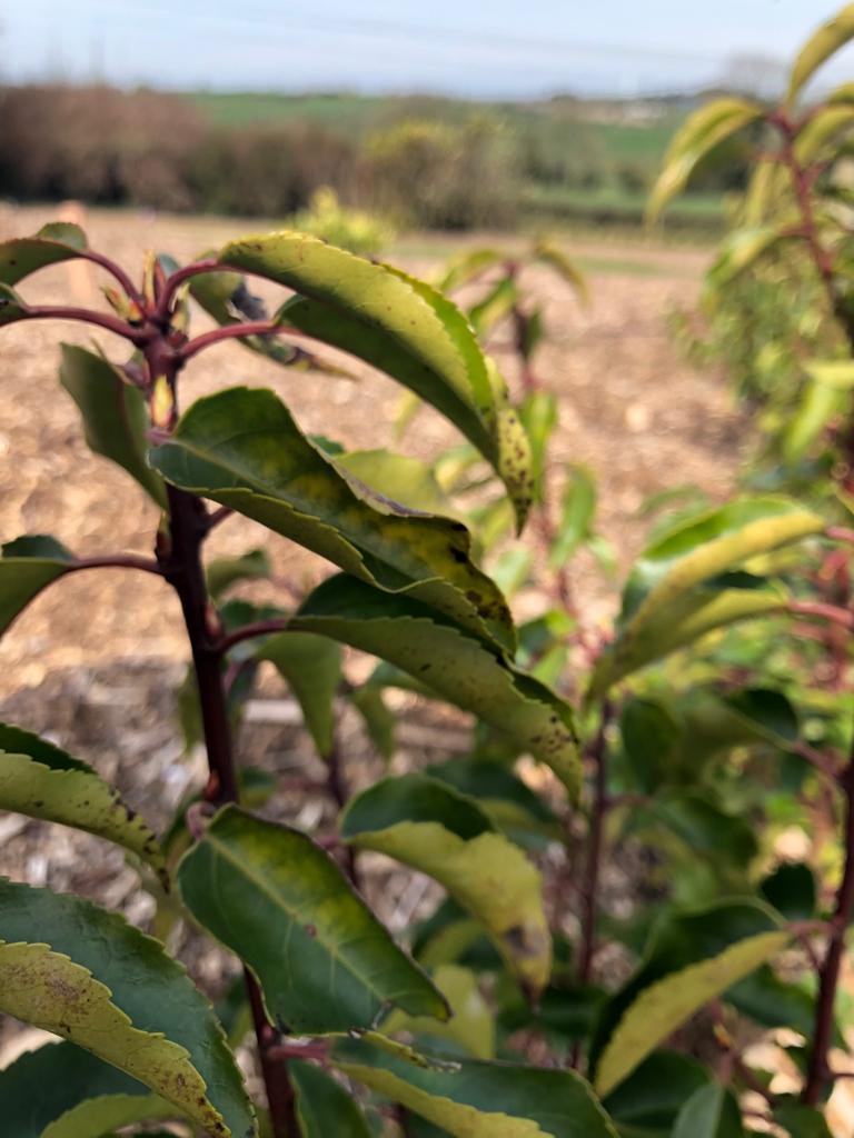 Hi, I’m new to all this gardening and about last Oct we had a row of Portuguese Laurel planted (about 120 plants) to form a new boundary between our neighbour and ourselves. Previous to this we had about 20 forty foot wide, forty foot tall leylandii trees. I spent all last summer taking them down and I hired a stump grinder to taken the stumps down as far as I could. The new Portuguese Laurel trees were about three foot tall and in pots, bought from a very reputable nursery and they were planted about a foot and a half apart. It’s was a very windy Winter and about a month ago we started to worry they weren’t doing well. The top of the trees seemed in worse condition that the bottom half. The leaves up top look more curled in and a lot of them yellowish and spotty. Some have a few holes in them and there is one in particular we’re the leaves have went brown and falling off but that’s the only one like that.