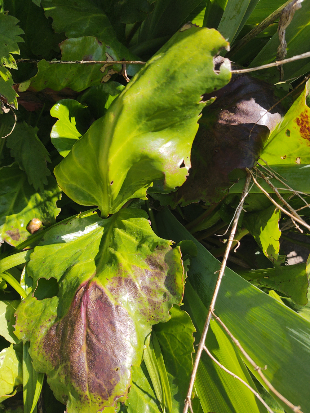 We've noticed some of our elephant ears plants have this brown colouring on the leaves. Not sure if it's a problem. A few days ago we discovered that our roses have a blackspot fungus problem and this looks a bit similar.