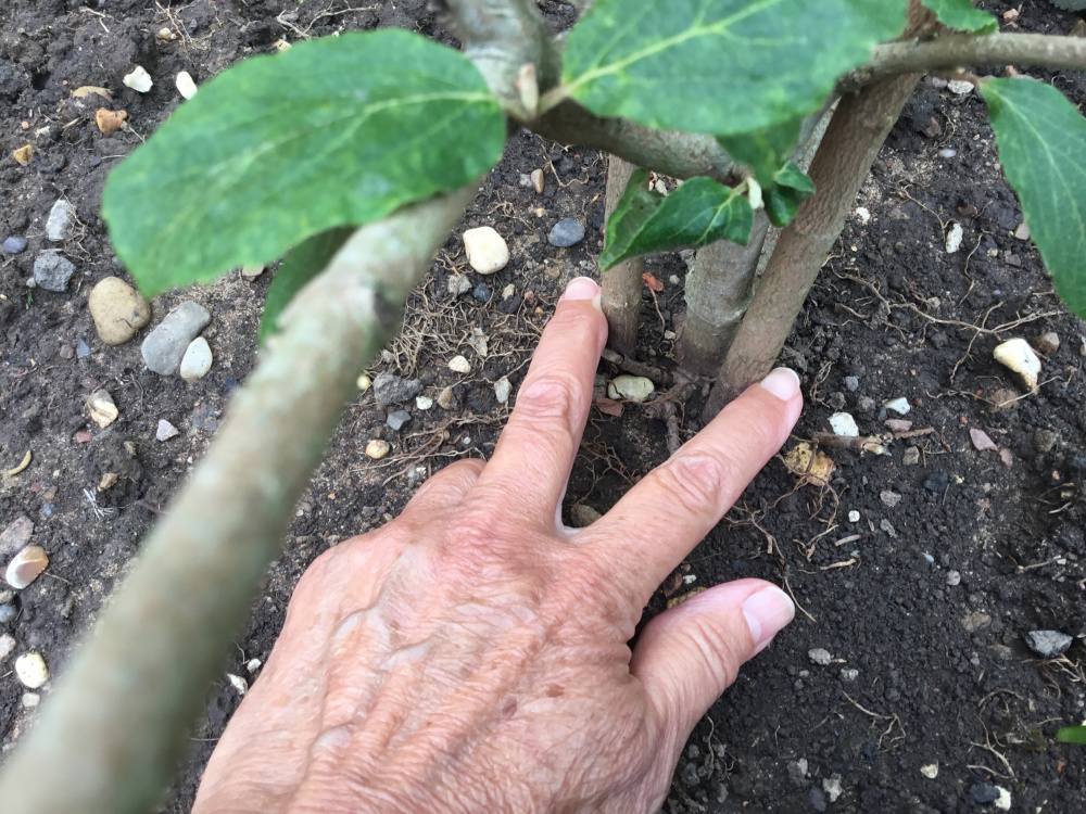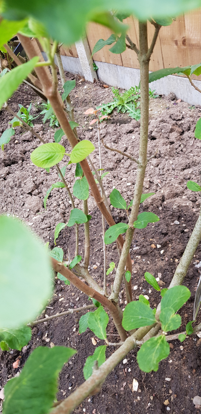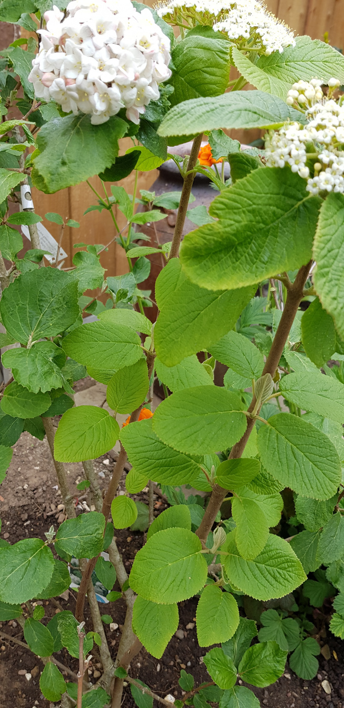 The two stems against my fingers belong to the plant I don’t recognise. The stem in the middle belongs to the viburnum I bought. Sorry yes the orange flower is a different plant. You can tell from the leaves of the two plants how different they are. I hope the picture is clearer showing the stems of each plant.