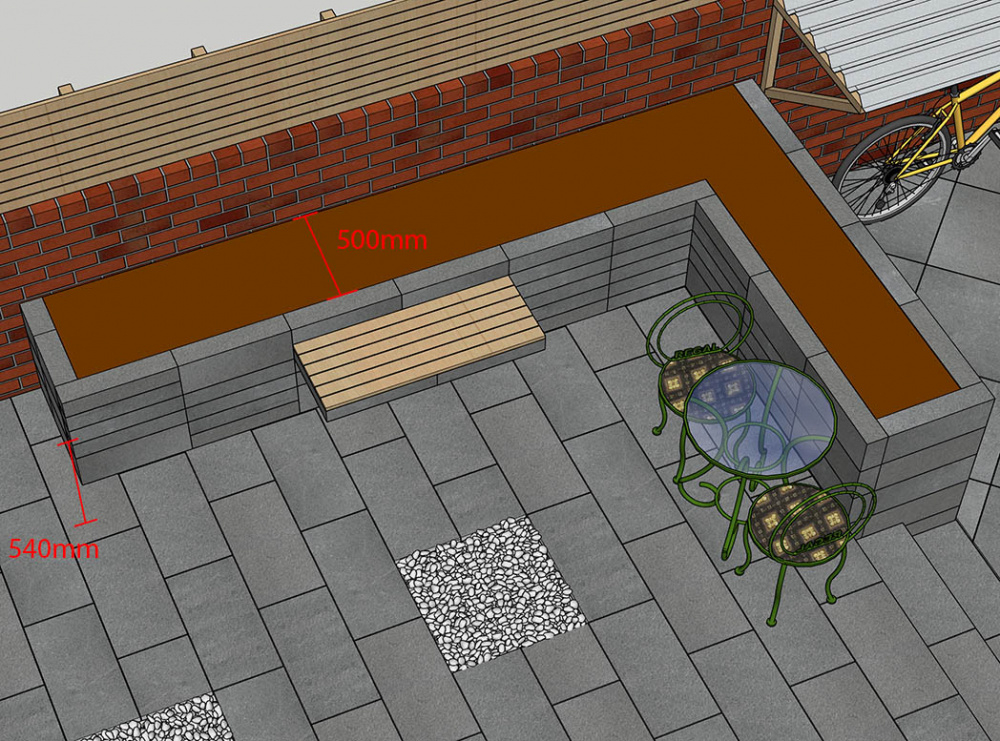 If 300/400mm is not enough space behind the bench I have come up with three alternative bench positions which involve removing the set back bench to give the planter an uniform depth along its entire length. Which of the 4 bench options do people prefer?