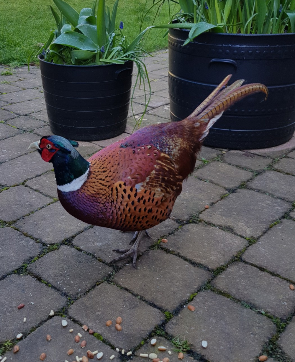I have a friendly pheasant too, he turns up daily for food every year, and always disappears off with females around this time too.