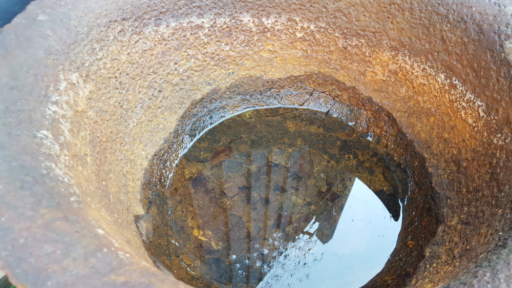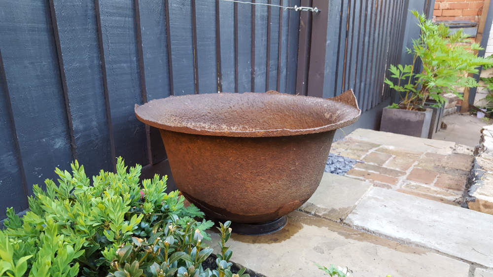 Someone was giving away this old iron bowl, I had to have it. I was going to use it as a water feature but there's a crack halfway up.