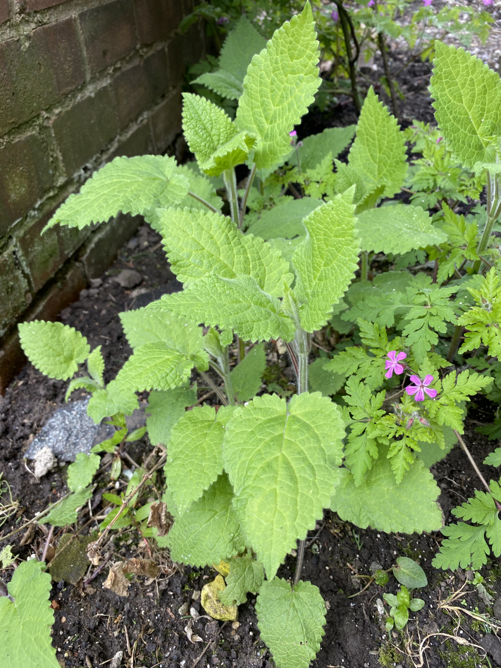 Hedge woundwort. Stachys sylvatica. It sends out runners underground like mint does.