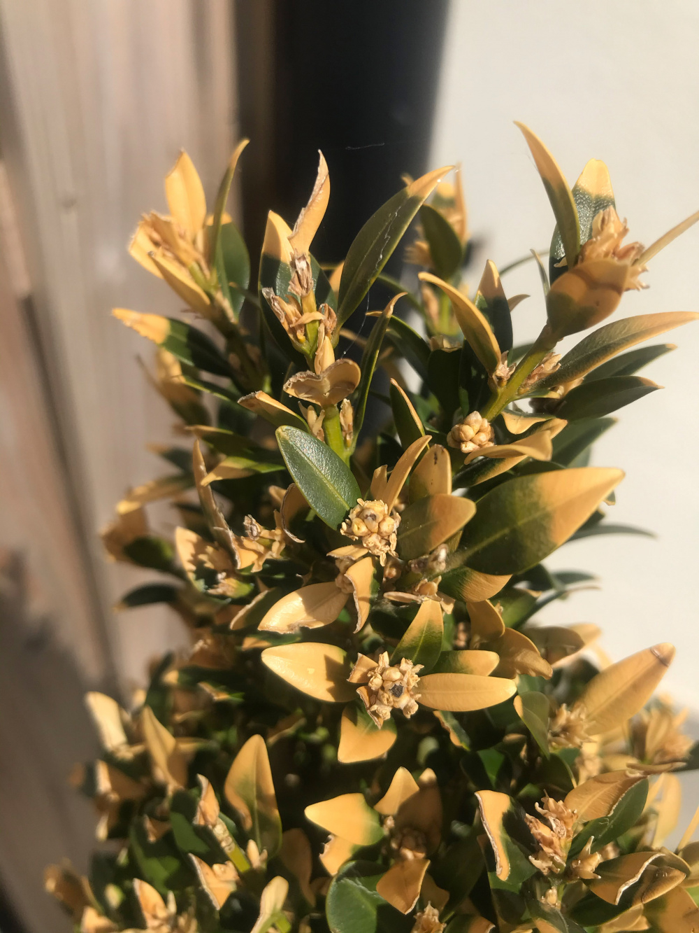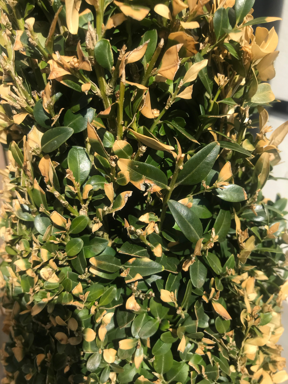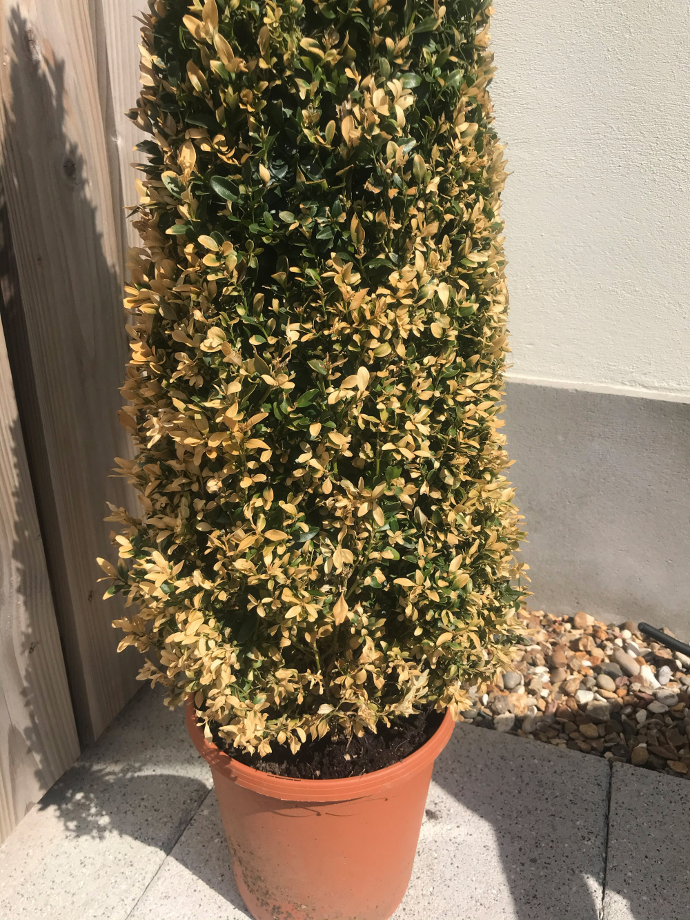 Hello - was hoping to get some advice. I recently purchased a buxus tree for the front of our house as we had toyed with the idea for quite some months. Unfortunately over the last 2 weeks it has started to go yellow. Not being very green fingered I have been a bit clueless as to why - it is in a north facing position the sun only touches it first thing in the morning so had ruled out scorched from the sun, our other reasoning for it was that we live in a seaside town and thought perhaps the salt from the sea air could have played a part but our neighbours also purchased buxus plants and there's look fine. So from narrowing down the options we thought it could be from poor drainage so we have removed it from the pot and placed it into its original pot to see if this would help before repotting it. It has been almost a week now and no signs of visible change - again I have no real knowledge of plants or how quick they can change but hoping for some advice as I have now read about root rot. I have attached a few pictures in the hope it will help. I should say that while we have moved it back into the original pot it is now in a south facing position.