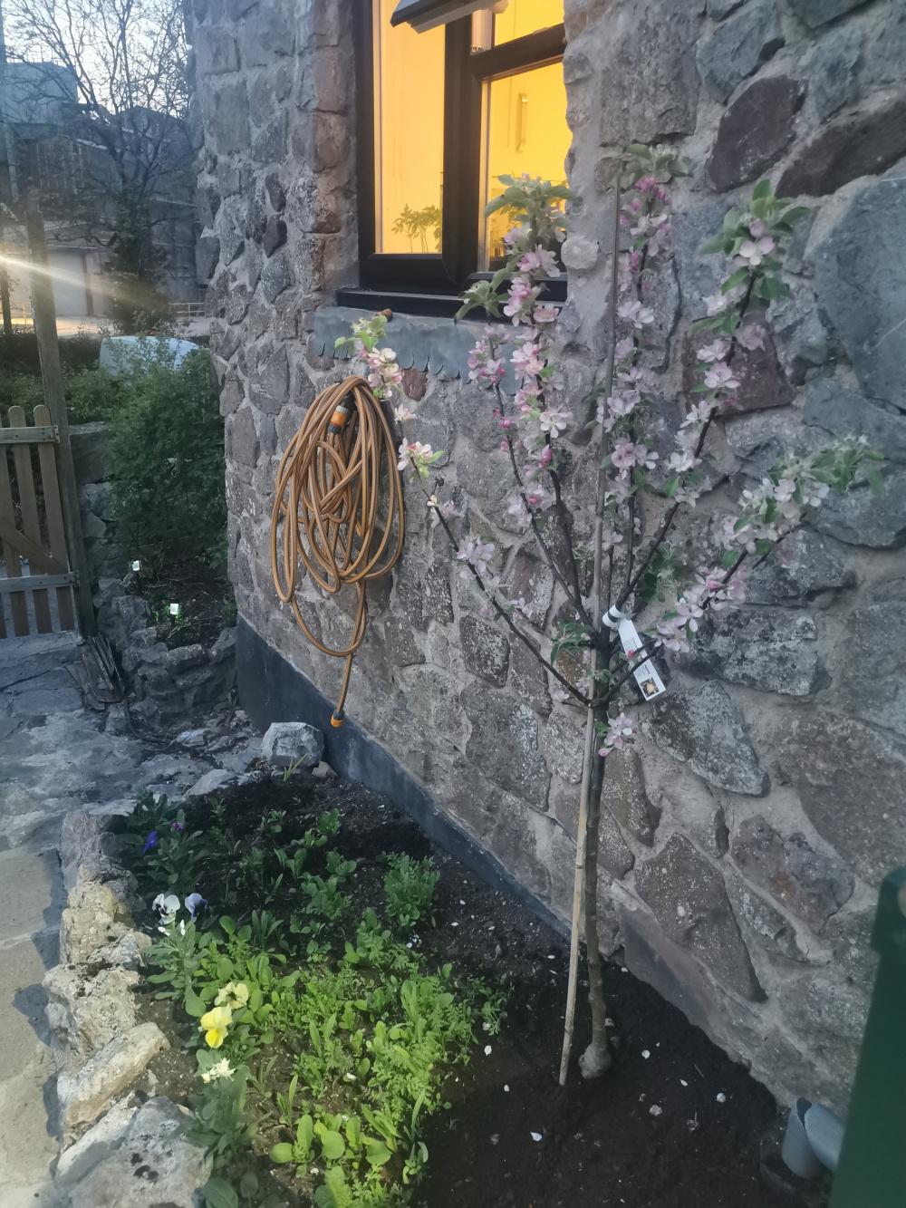 I brought this apple tree and planted it against my wall here but thinking now, have I planted it to close to the wall? Also there's a bedroom window from my neighbours above will it block her light? Thanks