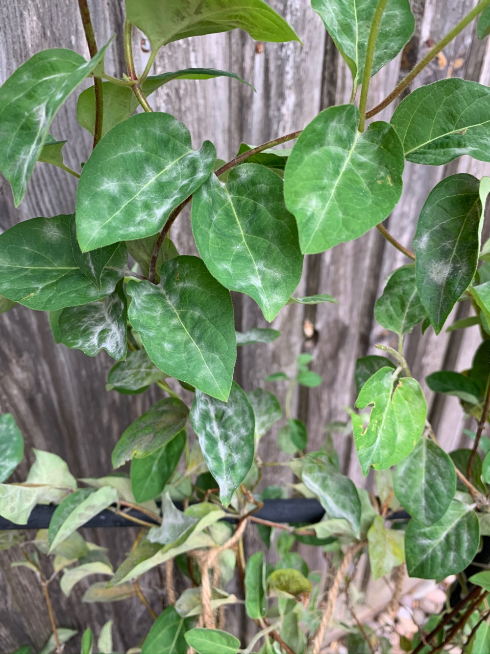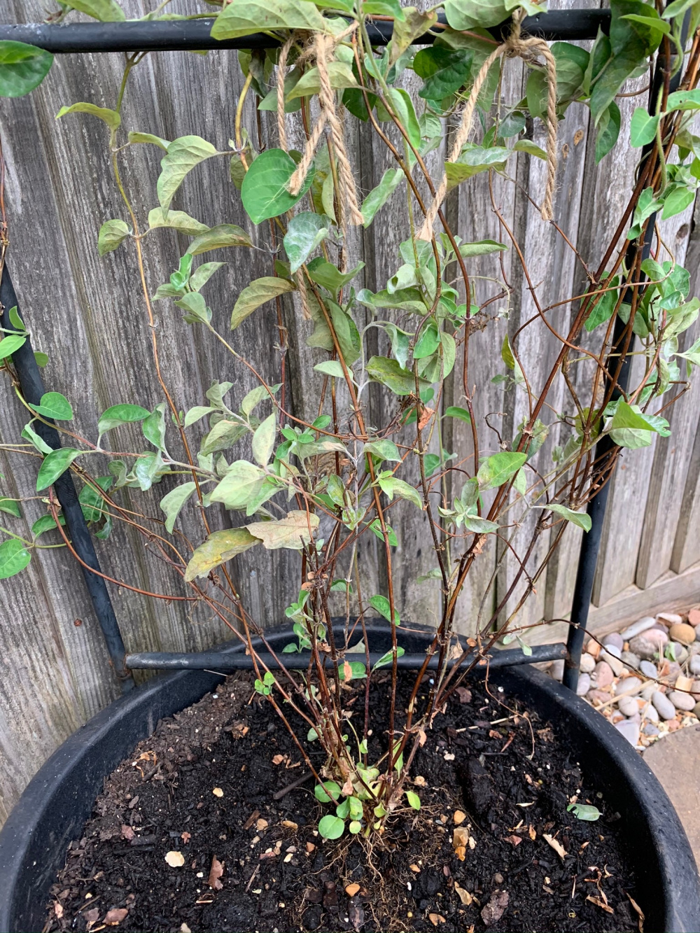 when I planted my honeysuckles a couple of months ago they were both very healthy. 2 weeks ago they were both dying from the bottom up. I carefully lifted them & put them in fresh compost in tubs. They haven’t improved & if anything have got worse. Also the leaves have white patches over them. Has anyone any idea what is happening to them & whether I can do anything to save them. Appreciate any advice. I have attached photos below.