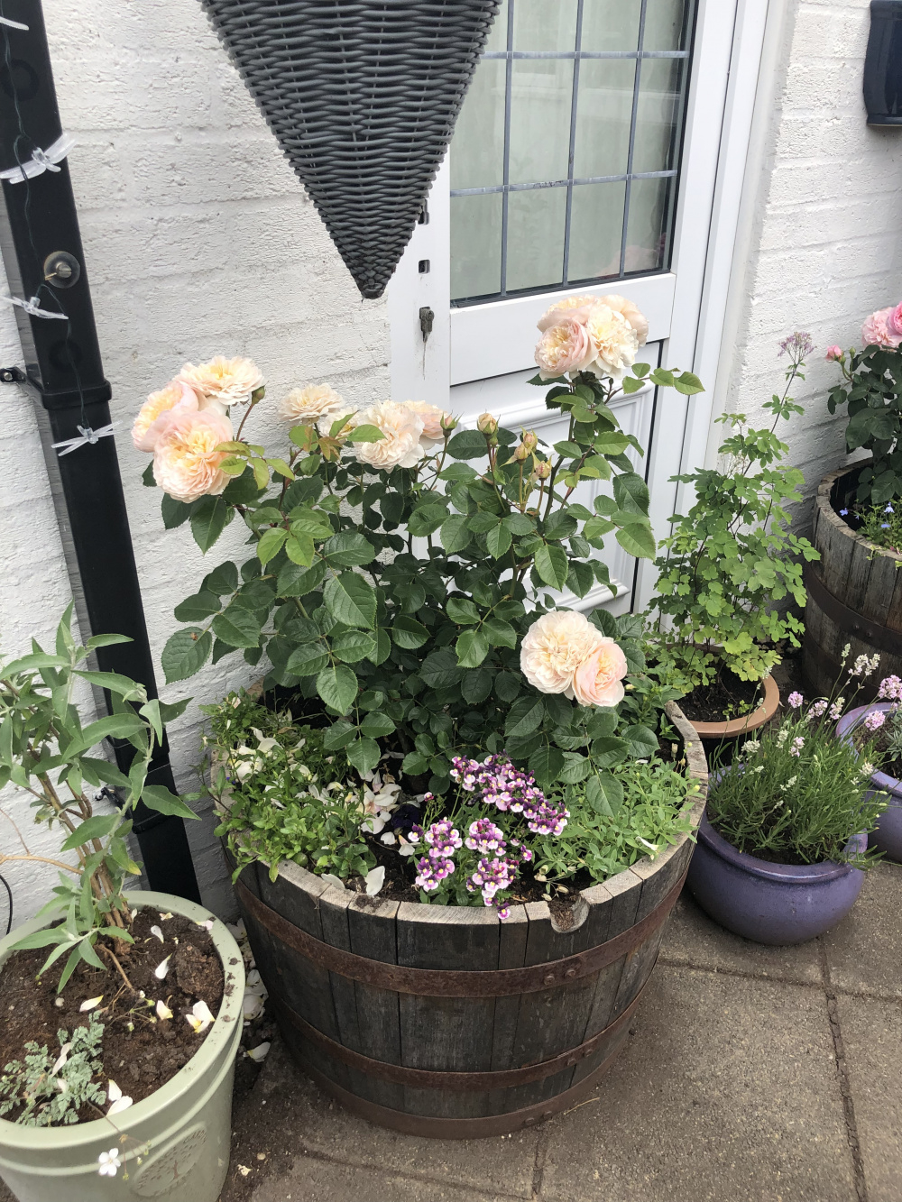 I've purchased two DA Roald Dahl bare root roses and planted them in ehlo containers D42 x H56cm and 26cm at the bottom.