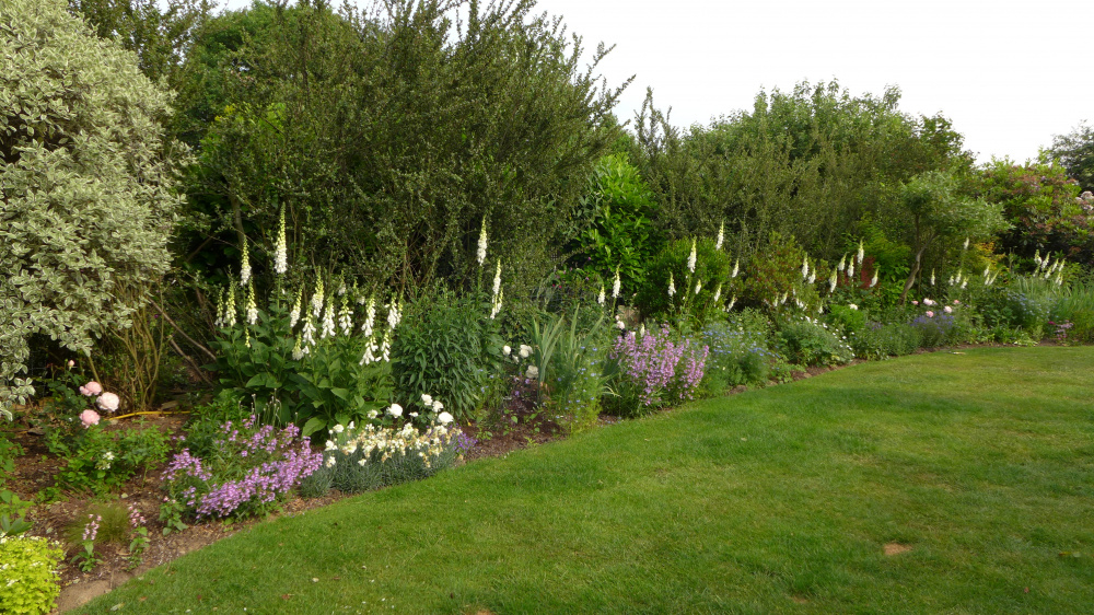 Previously this border was just a muddle of old shrubs from the 1970's, so in 2017 I removed them and started to create something more interesting. The white foxgloves were a real success, so will be sowing more next month for a display next year.