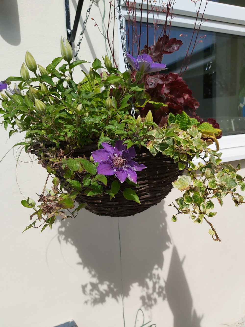 I'm definitely going to look out for Little Lemon; I've got a bit of a soft spot for extra compact clems! I've got a couple of the Evison "Boulevard" varieties - filigree and bijou, both of them were 2yr old garden centre sized plants, bought last year. The bijou is in a 14" hanging basket and is sharing nicely with a heuchera, a small grass and (currently) some primroses (soon to be replaced with some summer annuals), it gets sun all morning but is shaded in the hotter part of the day. It's literally just started flowering this week! As you might be able to see, it already takes up a fair chunk of real estate and this one trails as well as mounds. I would guess it might get a bit crowded by next year in the same setup.