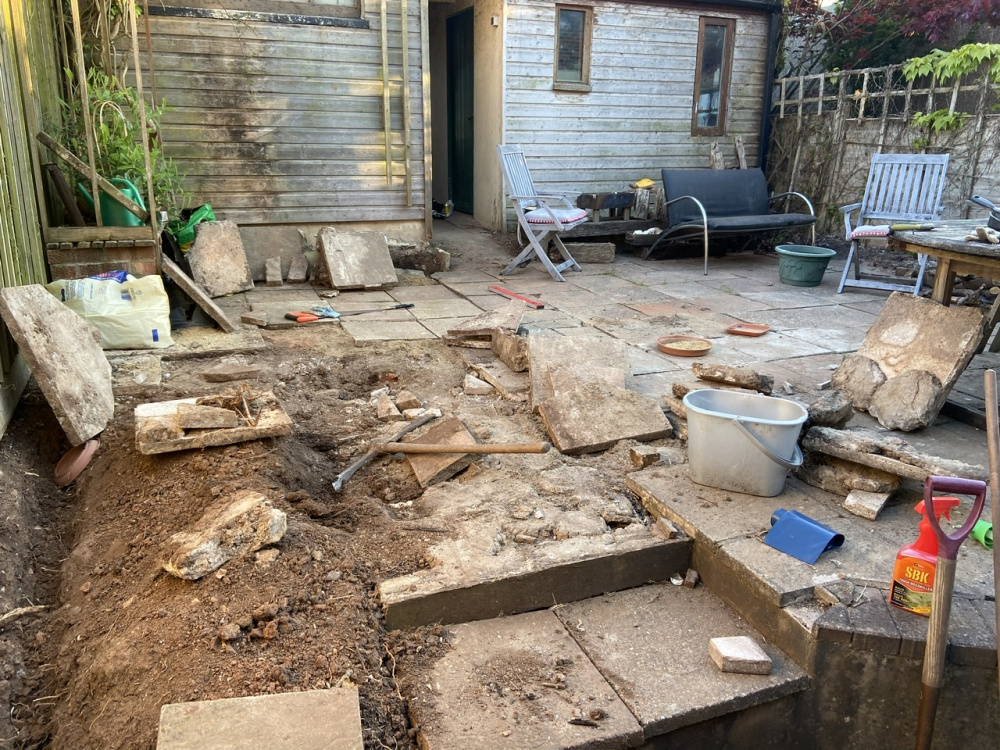 The patio tiles started to rise and after lifting a few up realised the patio was also riddled with thick bamboo shoots. I’ve dug up the patio bamboo and carefully put the slabs back however there were a few sections where it went too deep and I’ve now got a big hole in my patio.