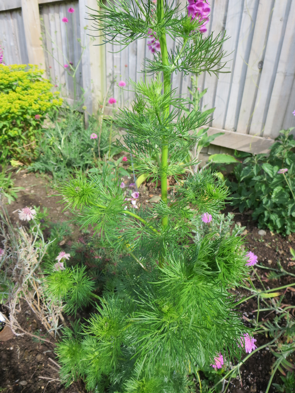Hello everyone I have asked friends but no one knows. Please could you tell me what the tall plant is (centre photo - frondy looking) - I have 3 in the garden, they are getting taller and taller but no sign of a flower Thanks , Alex