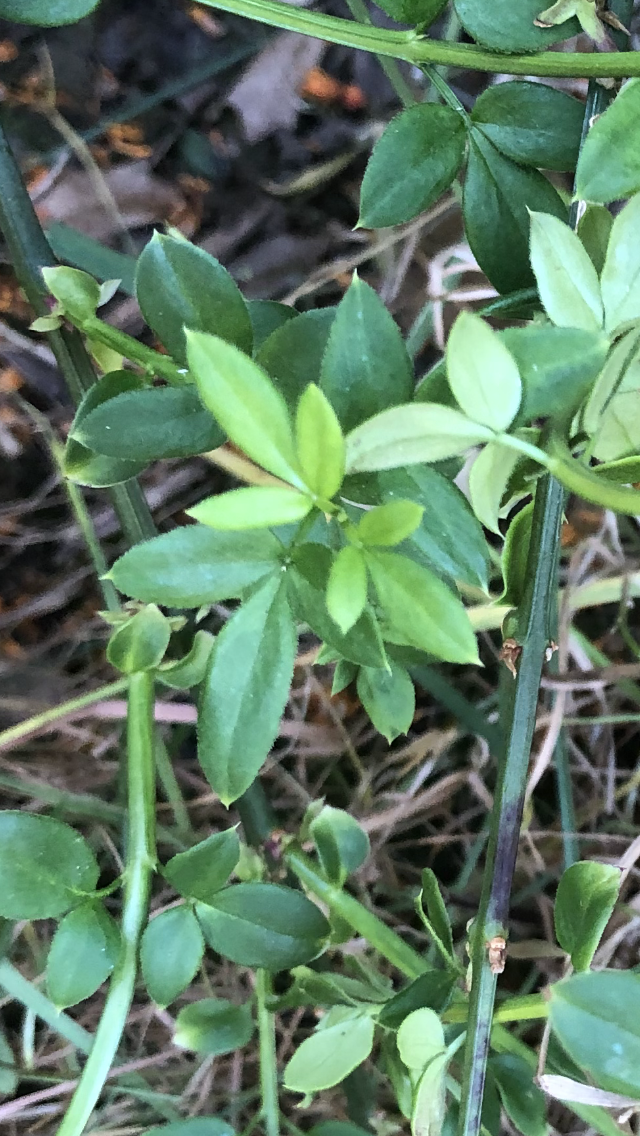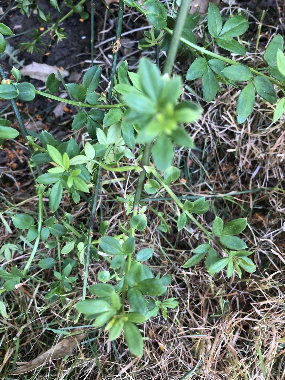 Looks like winter jasmine, Jasminum nudiflorum. It has yellow flowers in late winter/early spring, and it doesn't twine sowill need tying in to its support.