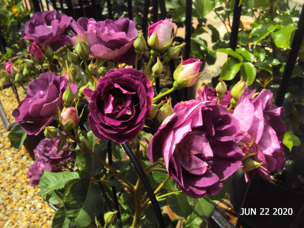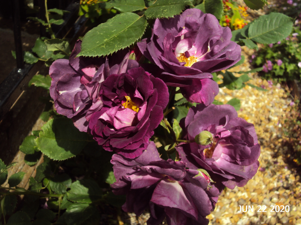 ..some more on the above rose... the blooms are sweetly scented, insect friendly, the foliage is large, healthy and olive green.. it forms large floribunda heads of buds, 30 or more to a cluster.. and to top it all, it's totally thornless above the lowest 6 inches.. It's also very vigorous, throwing up frequent basals.. the blooms fade to a purple/slate grey colour, but not as offputting for me as, say, Blue For You.. A top rose from northern British breeder Ronnie Rawlins, of Huddersfield...