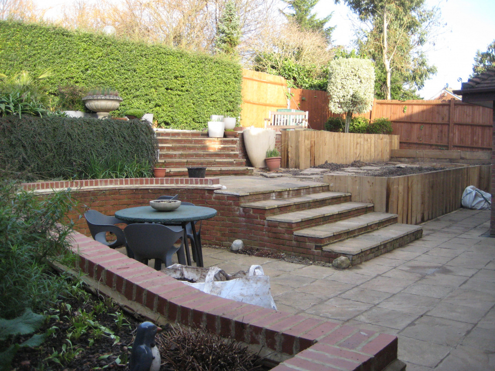 Terraced - Agree with the others, use sleepers for a more consistent look. Cinder blocks are awful, and will be lost as @Greenbird says. If you use sleepers, make sure to add gravel behind them, and a membrane to reduce soil contact. Most importantly, do not let any of your plants cover the top of the sleepers, especially low, creeping plants. This will increase the likelihood of them rotting, which we experienced badly.